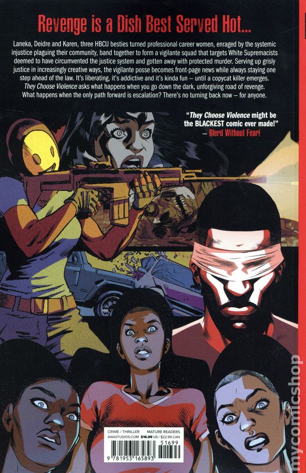 1st printing. Collects They Choose Violence (2025 AWA) #1-5. Written by Sheldon Allen. Art by Mauricio Campatella. Cover by Rahzzah. Laneka, Deidre and Karen, three HBCU besties turned professional career women, enraged by the systemic injustice plaguing their community, band together to form a vigilante squad that targets White Supremacists deemed to have circumvented the justice system and gotten away with protected murder. Serving up grisly justice in increasingly creative ways, the vigilante posse becomes front-page news while always staying one step ahead of the law. Its liberating, its addictive and its kinda fun – until a copycat killer emerges. They Choose Violence asks what happens when you go down the dark, unforgiving road of revenge? What happens when the only path forward is escalation? Theres no turning back now – for anyone. Softcover, 176 pages, full color. Mature Readers Cover price $16.99.