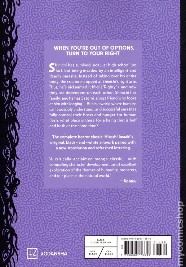 Volume 1 - 1st printing. Story and art by Hitoshi Iwaaki. Translated by Andrew Cunningham and Stephen Paul. Experience the immortal horror manga as it was originally meant to be read! For the first time in more than a decade, the Parasyte Paperback Collection pairs Hitoshi Iwaakis original, black-and-white art with a revised translation and updated interior and cover design. Teenager Shinichi wakes up one night to discover a creature crawling under the skin of his right arm. This is a Parasite, a creature that takes control of a persons body and turns it into a shapeshifting monstrosity hungry for human flesh. Shinichi has managed to stop his parasite with a tourniquet, and as a result, it takes over only his arm, leaving two consciousnesses sharing one body and dependent on each other to survive. As parasites take control of more and more people, rumors spread of brutal murders committed by terrible abominations—heads splitting open to reveal mouths of sharp teeth, batlike wings erupting from backs, blades tearing through soft bellies. Only Shinichi knows for sure that these rumors are all true. But can he find a way to live without destroying everyone he cares about, much less save the rest of humanity? Complete in eight volumes, Parasyte Paperback Collection features the translation, lettering, and size of the recent, acclaimed hardcover Parasyte Full Color Collection. This timeless manga inspired the global smash hit anime Parasyte -the maxim- and the live-action TV drama from the director of Train to Busan, Parasyte: The Grey. Softcover, 5 1/2-in.x 8-in., 288 pages, B&W. Older Teen (16+) Cover price $14.99.