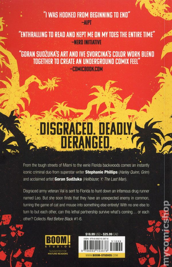 1st printing. Collects Red Before Black (2024 Boom) #1-6. Written by Stephanie Phillips. Art and Cover by Goran Sudžuka. A disgraced army veteran is sent to Florida to hunt down an infamous drug runner named Leo, but they soon find that they have an unexpected enemy in common, turning the game of cat and mouse into something else entirely! DISGRACED. DEADLY. DERANGED. From the tough streets of Miami to the eerie Florida backwoods comes an instantly iconic criminal duo from superstar writer Stephanie Phillips (Harley Quinn, Grim) and acclaimed artist Goran Sudžuka (Hellblazer, Y The Last Man). Disgraced army veteran Val is sent to Florida to hunt down an infamous drug runner named Leo. But she soon finds that they have an unexpected enemy in common, turning the game of cat and mouse into something else entirely! With no one else to turn to but each other, can this lethal partnership survive whats coming… or each other? Softcover, 160 pages, full color. Rated T+ Cover price $18.99.