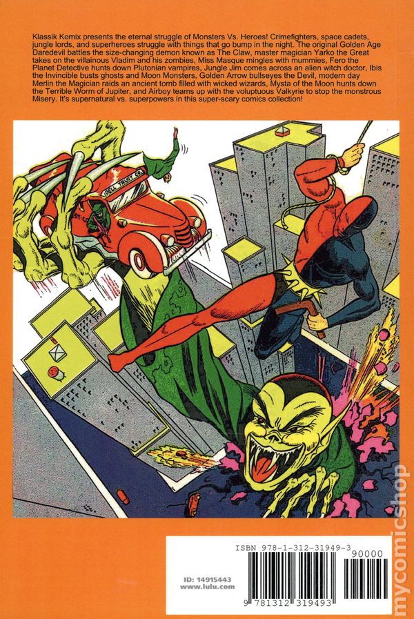 1st printing. Klassik Komix presents the eternal struggle of Monsters Vs. Heroes! Crimefighters, space cadets, jungle lords, and superheroes struggle with things that go bump in the night. The original Golden Age Daredevil battles the size-changing demon known as The Claw, learn the secret origins of the very first Mr. Monster as he tangles with the Terror of Trezma, master magician Yarko the Great takes on the villainous Vladim and his zombies, Miss Masque mingles with mummies, Fero the Planet Detective hunts down Plutonian vampires, Jungle Jim comes across an alien witch doctor, Ibis the Invincible busts ghosts and Moon Monsters, Golden Arrow bullseyes the Devil, modern day Merlin the Magician raids an ancient tomb filled with enormous insects and wicked wizards, Mysta of the Moon confronts the Terrible Worm of Jupiter, and Airboy teams up with the voluptuous Valkyrie to stop the monstrous Misery. It's supernatural vs. superpowers in this super-scary comics collection! Softcover, 6-in. x 9-in., 100 pages, B&W. Cover price $9.99.