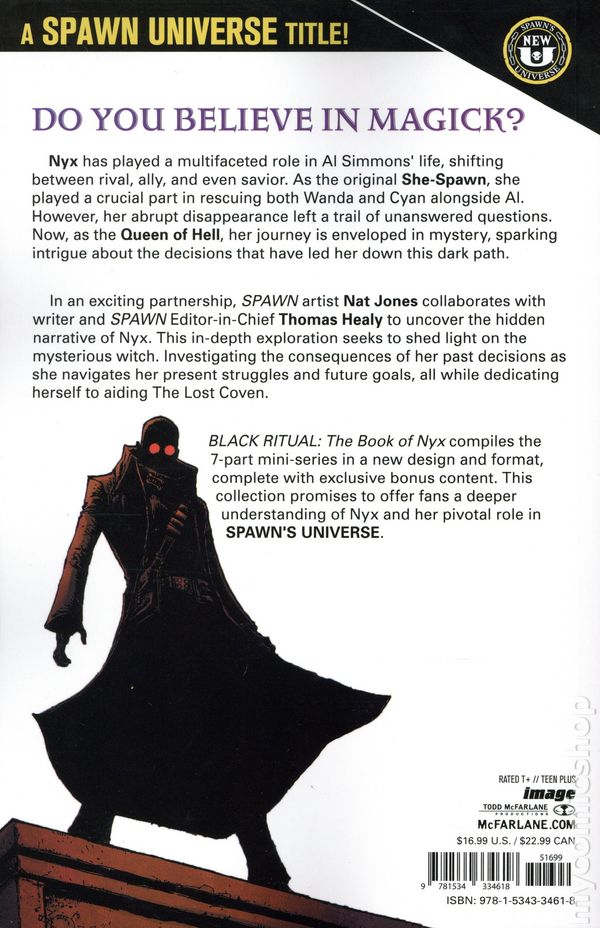 1st printing. Collects Black Ritual: The Book of Nyx (2025 Image) #1-7. Written by Thomas Healy and Todd McFarlane. Art and cover by Nat Jones. NYX has played a multifaceted role in Al Simmons' life, acting as both adversary and savior. She was the first She-Spawn and journeyed with Spawn into the bowels of hell itself. Then she rescued Wanda and Cyan from the clutches of the demon lord, Mammon. Then one day, she simply walked away and disappeared. SPAWN artist Nat Jones teams up with writer and SPAWN Editor-in-Chief Thomas Healy to delve into Nyx's untold stories, exploring the consequences of her past as she seeks to aid the hidden Covens of New York City. Additional features include a cover gallery and behind-the-scenes artwork. Softcover, 160 pages, full color. Teen+ Cover price $16.99.