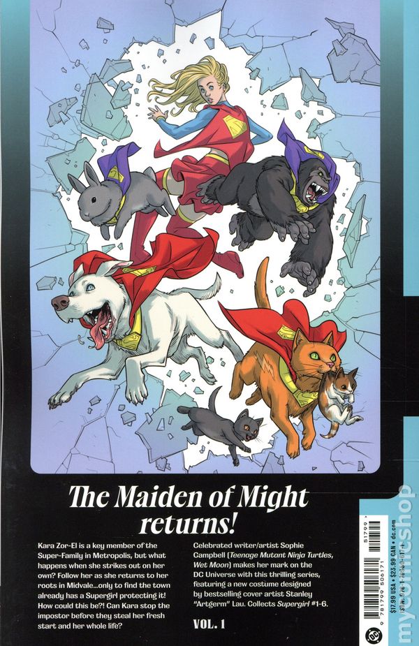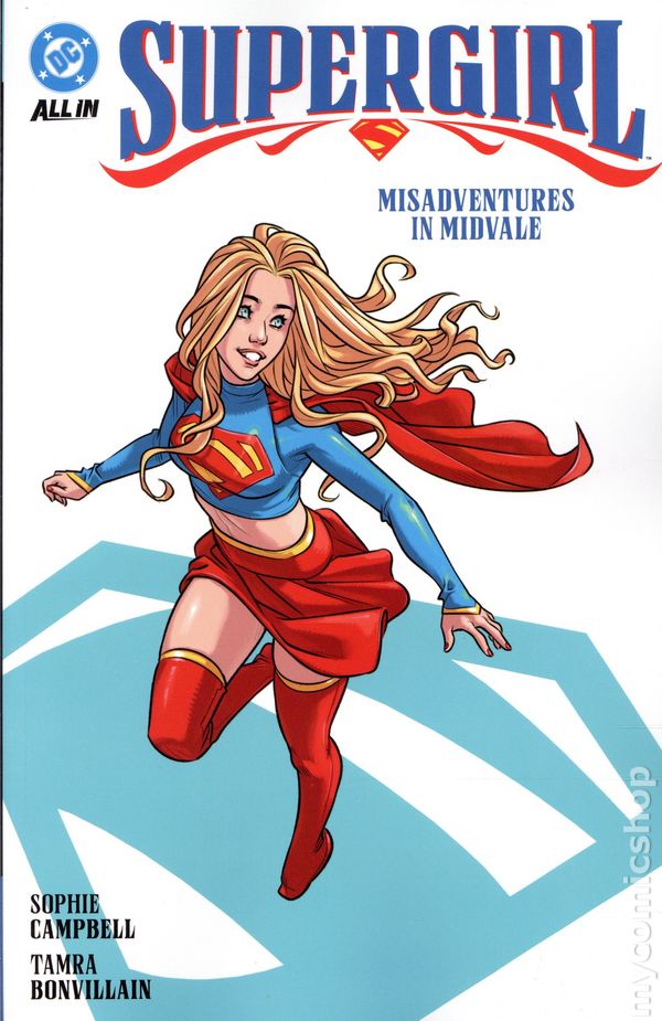 Volume 1 - 1st printing. "Misadventures of Midvale!" Collects Supergirl (2025 DC) #1-6. Written by Sophie Campbell. Art by Sophie Campbell, Rosi Kampe, and Paulina Ganucheau. Cover by Sophie Campbell. A NEW ERA OF SUPERGIRL STARTS HERE! Kara Zor-El is a key member of the Super-Family in Metropolis, but what happens when she strikes out on her own? Follow her as she returns to her roots in Midvale... only to find the town already has a Supergirl protecting it! How could this be?! Can Kara stop the impostor before they steal her fresh start and her whole life? Celebrated writer/artist Sophie Campbell (Teenage Mutant Ninja Turtles, Wet Moon) makes her mark on the DC Universe with this thrilling series, featuring a new costume designed by bestselling cover artist Stanley Artgerm Lau. Softcover, 144 pages, full color. Teen Cover price $17.99.