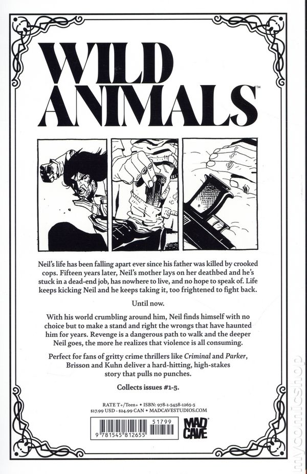 1st printing. Collects Wild Animals (2025 Mad Cave) #1-5. Written by Ed Brisson. Art and Cover by Andy Kuhn. Neils life has been falling apart ever since his father was killed by crooked cops. Fifteen years later, Neils mother lays on her deathbed and hes stuck in a dead-end job, has nowhere to live, and no hope to speak of. Life keeps kicking Neil and he keeps taking it, too frightened to fight back. Until now. With his world crumbling around him, Neil finds himself backed into a corner, with no choice but to make a stand and right the wrongs that have haunted him for years. Revenge is a dangerous path to walk and the deeper Neil goes, the more he realizes that violence is all consuming. Perfect for fans of gritty crime thrillers like Criminal and Parker, Brisson and Kuhn deliver a hard-hitting, high-stakes story that pulls no punches. Softcover, 128 pages, full color. Rated T+ Cover price $17.99.