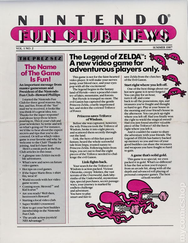 Summer 1987 - Vol 1 No. 2. Nintendo Fun Club News was a quarterly (then bi-monthly) newsletter advertising and giving tips for several Nintendo Entertainment System (NES) video games. This issue features an article covering The Legend of Zelda. 12 pages.