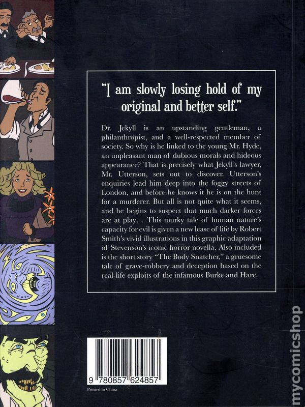 1st printing. Based on the Stories by Robert Louis Stevenson. Art and cover by Robert Smith. "I am slowly losing hold of my original better self." Dr. Jekyll is upstanding gentleman, a philanthropist, and well-respected member of society. So why is he linked to the young Mr. Hyde, an unpleasant man of dubious morals and hideous appearance? That is precisely what Jekyll's lawyer, Mr. Utterson, sets out to discover. Utteson's enquiries lead him deep into the foggy streets of London, and before he knows it he is on the hunt for a murderer. But all is not quite what it seems, and he begins to suspect that much darker forces are at play... This murky tale of human nature's capacity for evil is given a new lease of life by Robert Smith's vivid illustrations in this graphic adaptation of Stevenson's iconic horror novella. Also included int he short story "The Body Snatchers," a gruesome tale of grave-robbery and deception based on the real-life exploits of the infamous Burke and Hare. Softcover, 6 1/2-in. x 9-in., 160 pages, full color.