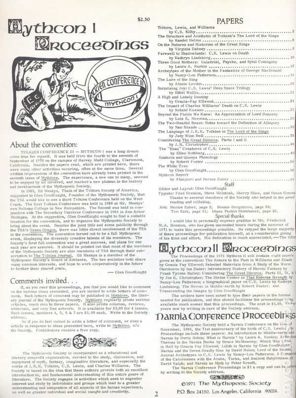 Mythcon, the Mythopoeic Conference, is a convention devoted to Mythopoeic literature run annually by the Mythopoeic Society since 1970. 8.5" x 11", 60 pages, B&W Cover price $2.50.