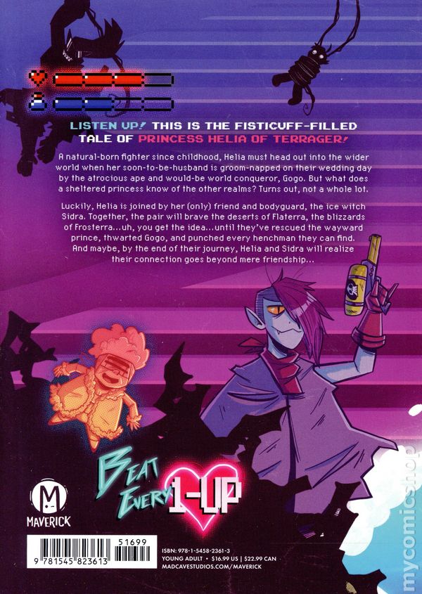 1st printing. Written by Lan Pitts. Art and cover by Joe Hunter. Listen up! This is the fisticuff-filled tale of Princess Helia of Terrager: a natural-born fighter since childhood, Helia must head out into the wider world when her soon-to-be-husband is groom-napped on their wedding day by the atrocious ape, and would-be world conqueror, Gogo. But what does a sheltered princess know of the other realms? Well, not a whole lot. Luckily, Helia is joined by her (only) friend and bodyguard, the ice witch, Sidra. Together, the pair will brave the deserts of Flaterra, the blizzards of Frosterra…uh, you get the idea…until theyve rescued the wayward prince, thwarted Gogo, and punched every henchman they can find. And maybe, by the end of their journey, Helia and Sidra will realize their connection goes beyond mere friendship… …find out in BEAT EVERY 1-UP, a young adult graphic novel that will bring a new definition to your princess is in another castle! Softcover, 6-in. x 8 1/2-in., 184 pages, full color. Young Adult Cover price $16.99.