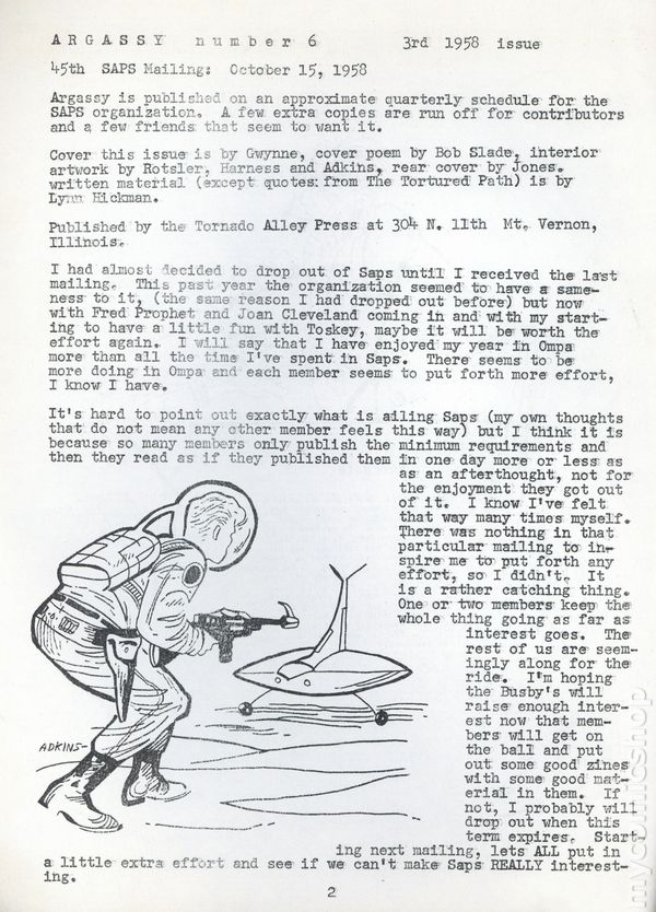 Apazine published by Lynn Hickman for SAPS which eventually merged into JD-Argassy. The title is a nod to the mainstream magazine Argosy. 8.5" x 11", 10 pages, B&W.