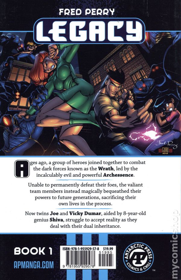 Volume 1 - 1st printing. Story and art by Fred Perry. This month, from Antarctic Press! FIRST TIME COLLECTED AT FULL SIZE! Ages ago, a group of heroes joined together to combat the dark forces known as the Wrath, led by the incalculably evil and powerful Archessence. Unable to permanently defeat their foes, the valiant team members instead magically bequeathed their powers to future generations, sacrificing their own lives in the process. Now twins Joe and Vicky Dumar, aided by 8-year-old genius Shiva, struggle to accept reality as they deal with their dual inheritance. Softcover, 6 1/2-in. x 10 1/4-in., 144 pages, full color. Teen Cover price $19.99.