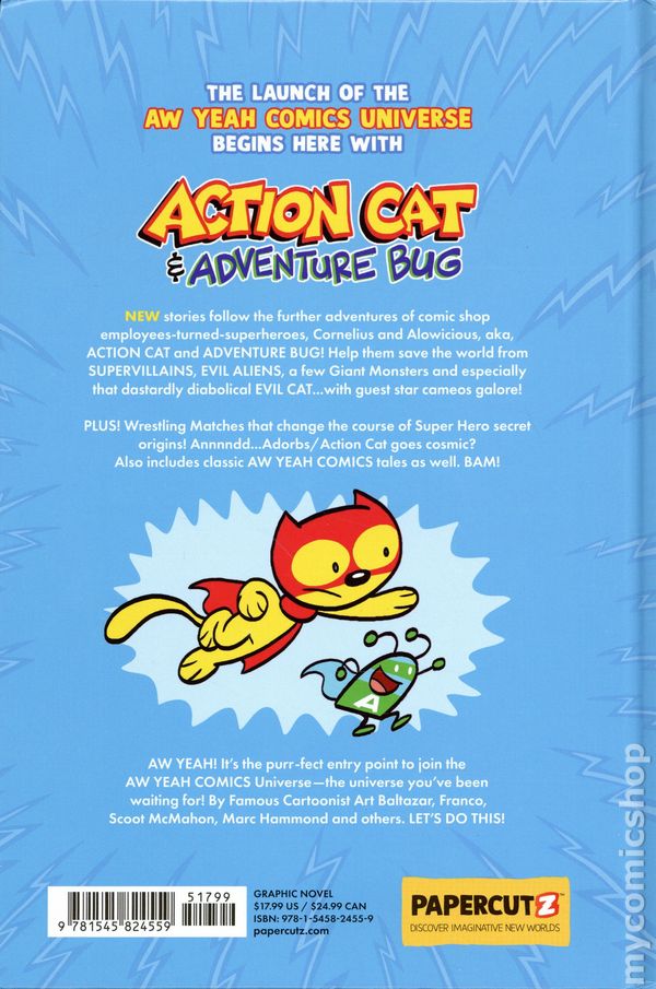 Volume 1 - 1st printing. "Let's Do This!" Written by Art Baltazar and Franco. Art and cover by Art Baltazar. The launch of the AW YEAH COMICS UNIVERSE begins here with ACTION CAT and ADVENTURE BUG: Let's Do This! NEW stories follow the further adventures of comic shop employees, Cornelius and Alowicious, aka, ACTION CAT and ADVENTURE BUG! Help them save the world from... SUPERVILLAINS, EVIL ALIENS, a few Giant Monsters, and especially the diabolical EVIL CAT...with guest stars galore! PLUS! Adorbs/Action Cat goes cosmic and other classic tales. AW YEAH! An entry point to join the AW YEAH COMICS Universe--the universe you've been waiting for! Hardcover, 6-in. x 9-in., 88 pages, full color. All Ages Cover price $17.99.