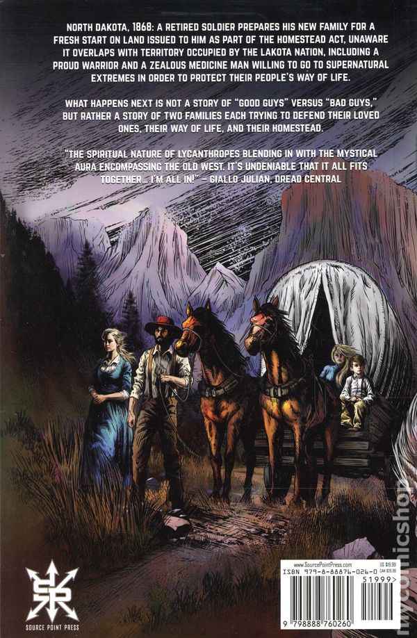 1st printing. Written by Dirk Manning. Art and cover by Les Lindon Garner. Lakota Creative Consultant: Rau Redsky Blackhawk. North Dakota, 1868: a retired soldier prepares his new family for a fresh start on land issued to him as part of the Homestead Act, unaware it overlaps with territory occupied by the Lakota Nation, including a proud warrior and a zeaous medicine man willling to go to supernatural extremes in order to protect their people's way of life. What happens next is not a story of "good guys" versus "bad guys," but rather a story of two families each trying to defend their loved ones, their way of life, and their homestead. Written by Dirk Manning, illustrated by Les Lindon Garner, colored by Colin Johnson, lettered by Dave Lentz, and edited by Drena Jo with a cover by Les Lindon Garner. Softcover, 104 pages, full color. Mature Readers Cover price $19.99.