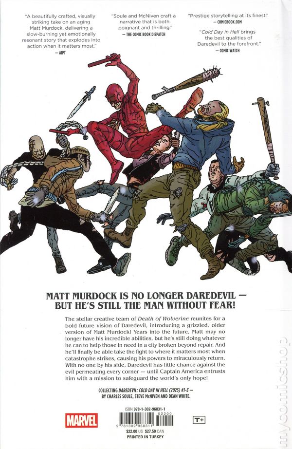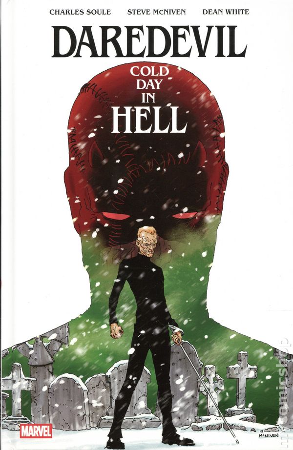1st printing. Collects Daredevil: Cold Day in Hell (2025 Marvel) #1-3. Written by Charles Soule and Steve McNiven. Art and cover by Steve McNiven. The superstar team behind Death of Wolverine reunite for a bold, dystopian saga that redefines Daredevil at the end of his life and at the edge of a broken world. In a future where heroes have fallen and New York lies in ruins, an aging MATT MURDOCK has left his days as DAREDEVIL behind. But when CAPTAIN AMERICA entrusts him with one last mission, Matt is forced back into a war he thought hed left forever. His powers flicker unpredictably, his body is frail, and the enemy he must face—a grotesque, relentless BULLSEYE—is deadlier than ever. Joined only by the innocent lives caught in the crossfire, and with fleeting moments of strength to guide him, Daredevil must decide what still keeps him fighting: his faith, his sense of justice, or simply the refusal to let evil rule unchecked. Rendered with cinematic intensity by Eisner Award-nominee Steve McNiven (Civil War, Old Man Logan), and written with unflinching heart by #1 New York Times bestselling author Charles Soule (Daredevil: Back in Black, Star Wars), DAREDEVIL: COLD DAY IN HELL is a timeless reminder of why heroes endure even in a world consumed by darkness. Daredevils final stand is more than a fight – its a RECKONING. BONUS CONTENT: plot excerpts, thumbnails, layouts, pencils, inks and Steve McNiven commentary. Hardcover, 128 pages, full color. Rated T+ Cover price $22.00.