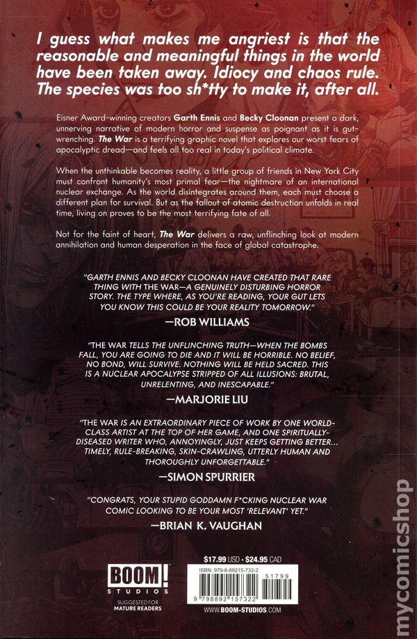 1st printing. Collects The War (2025 Boom) #1-3. Written by Garth Ennis. Art and cover by Becky Cloonan. Its the end of the world as they know it, but the worst is still to come. From the pages of the breakout horror anthology HELLO DARKNESS comes a chilling tale of apocalyptic dread from Eisner Award–winning creators Garth Ennis and Becky Cloonan. When the unthinkable becomes reality, a group of friends in New York City must confront their worst fears—the outbreak of nuclear war. As society collapses around them, each must choose a different plan for survival at the end of the world. But with the fallout of nuclear destruction unfolding in real time, survival may be the most terrifying fate of all. THE WAR delivers a raw, unflinching look at modern annihilation and human desperation in the face of global catastrophe—just as timely as it is terrifying. Softcover, 112 pages, full color. Rated T Cover price $17.99.