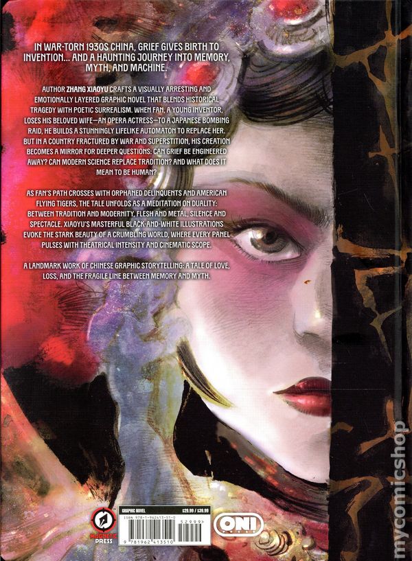 1st printing. Story and art by Zhang Xiaoyu. Love is never lost . . . Fan is a young Chinese engineer who lost his wife in a Japanese bombing raid in 1937. Mingfeng was a popular performer at the local opera, and he is devastated by the loss. Distraught, he builds an extraordinary automaton that replaces her at the theater. Meanwhile, war rages throughout the city, and orphaned children run wild under the direction of local potentates in an attempt to thrive and survive. When those potentates take notice of the mysterious beauty, suspicions and desires start to grow. Mix in an American airman and the tensions of war, and things build to an explosive finale. Masterfully mixing a snapshot of war-torn China with the philosophical sci-fi questions of a Philip K. Dick novel, Twin Lotuses is a beautifully illustrated story capturing an ugly time and the flicker of hope, love, and ambition that shone through it all. Hardcover, 8 1/2-in. x 11-in., 324 pages, B&W. Cover price $29.99.
