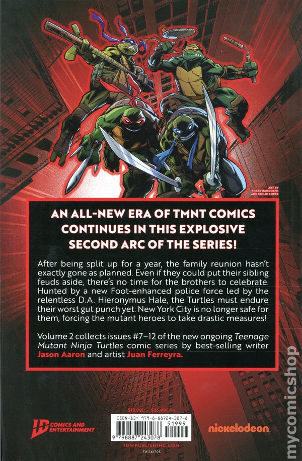 1st printing. Collects Teenage Mutant Ninja Turtles (2024 IDW) #7-12. Written by Jason Aaron. Art and cover by Juan Ferreyra. Back Cover by Khary Randolph and Emilio Lopez. An all-new era of TMNT comics continues in this explosive second arc of the series! After being split up for some time, the family reunion hasn't exactly gone as planned. Even if they could put their sibling feuds aside, there's no time for the brothers to celebrate. Hunted by a new Foot-enhanced police force led by the relentless D.A. Hieronymus Hale, the Turtle brothers must endure their worst gut punch yet: New York City is no longer safe for the TMNT, forcing the mutant heroes to take drastic measures! Volume 2 collects issues #7–12 of the new ongoing Teenage Mutant Ninja Turtles comic series by bestselling writer Jason Aaron and artist Juan Ferreyra. More than two million Teenage Mutant Ninja Turtles comics have been sold in 2024! Join in on the fun! Softcover, 160 pages, full color. Rated T Cover price $19.99.
