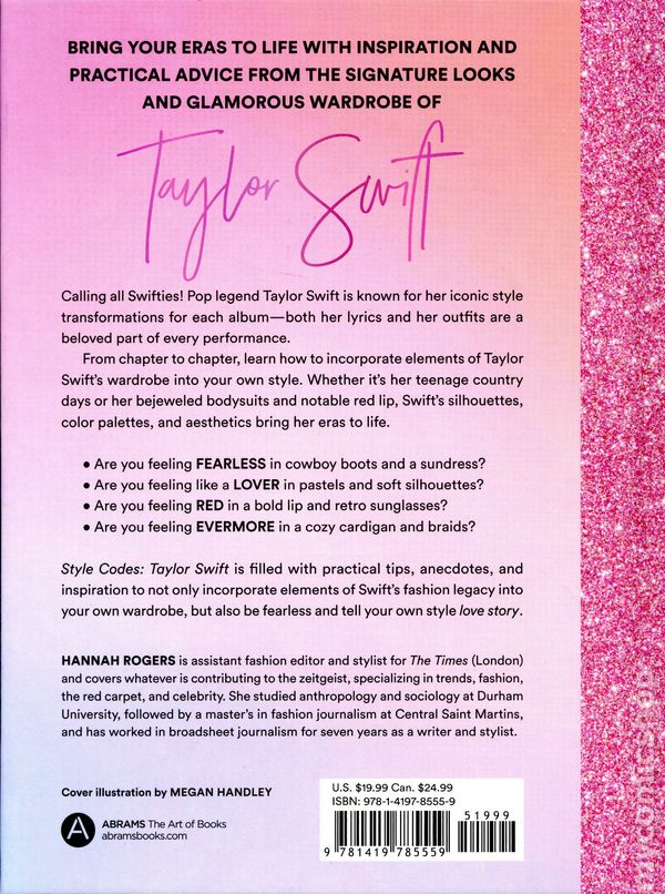 1st printing. By Hannah Rogers. Bring you eras to life with inspiration and practical advice from the signature looks and glamorous wardrobe of Taylor Swift Calling all Swifties! Pop legend Taylor Swift is known for her iconic style transformations for each album, both her lyrics and outfits are a beloved part of the performance. From chapter to chapter, learn how to incorporate elements of Taylor Swifts wardrobe into your own style. From her teenage country days to her bejeweled bodysuits and notable red lip, Swifts silhouettes, color palettes, and aesthetics bring her eras to life. Are you feeling FEARLESS in cowboy boots and a sundress? Are you feeling like a LOVER in pastels and soft silhouettes? Are you feeling RED in a bold lip and retro sunglasses?Are you feeling EVERMORE in a cozy cardigan and braids? Style Codes: Taylor Swift is filled with practical tips, anecdotes, and inspiration to not only incorporate elements of Swifts fashion legacy into your own wardrobe, but how to be fearless and tell your own style love story. Hardcover, 5 1/2-in. x 7 1/2-in., 192 pages, full color. Cover price $19.99.