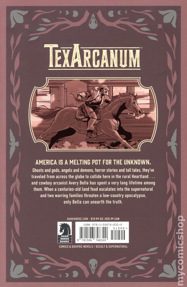 1st printing. Collects TexArcanum (2025 Dark Horse) #1-4. Written by Christopher Monfette. Art and cover by Miguel Martos. Horror in the heartland in this supernatural melting pot of American terror! Dark Horse Comics presents TexArcanum, a new horror miniseries that mashes unfamiliar mythologies and American identities into one new story, from television writer and producer Christopher Monfette (Star Trek: Picard, Marvels Vision, 12 Monkeys). America is a melting pot for the unknown. Ghosts and gods, angels and demons, horror stories and tall-tales, theyve traveled from across the globe to collide here in the rural Heartland… and cowboy arcanist Avery Belle has spent a very long lifetime among them. When a centuries-old land feud escalates into the supernatural, when two warring families threaten a low-country apocalypse, only Belle can unearth the truth. TexArcanum is Yellowstone meets X-Files, Elmore Leonard meets Stephen King, horror-noir in the mystic Mid-West. Softcover, 104 pages, full color. Rated T Cover price $19.99.