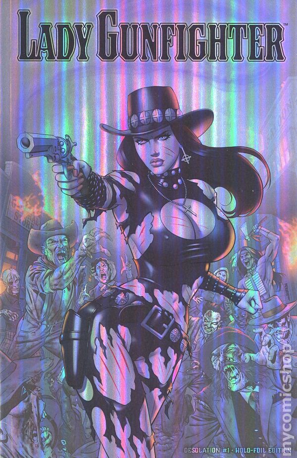 Holo-Foil Edition Cover by Matt Merhoff. Story by Brian Pulido and Mike MacLean. Art by Joel Gomez. Set in 1876, post Civil War America. As a teenager, Eliza Ryan was Lady Gunfighter, star attraction of Winchester Willie's Traveling Wild West Show. But Eliza gave up her sharpshooting ways to become a loving wife and mother. Then came that fateful night of bloodshed and fire. Ten years later, Eliza dons the Lady Gunfighter moniker once again and journeys across the ultraviolent hellscape that is the old west. A demonic revolver rides in her gun belt, a weapon of dark power that whispers to Lady Gunfighter in an ancient, malevolent language. Will cursed bullets and sharpshooting skills be enough to stop the man responsible for destroying Eliza's family- the infamous killer Jebediah Kane? 52 pages, full color.