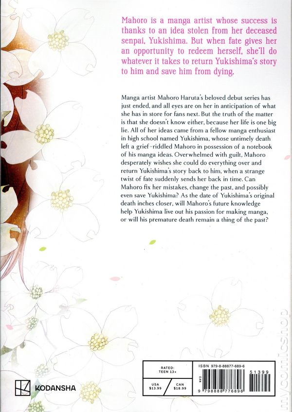 Volume 1 - 1st printing. Story and art by Shiki Kawabata. Translated by Sawa Matsueda Savage. A poignant and funny time-skip manga about grief, art, and love, like Orange meets Monthly Girls' Nozaki-kun, from the creator behind the Netflix miniseries Switched. Complete in five volumes. Mahoro's high school manga club had two members: her and a classmate who passed away months after they met. Now, she's an award-winning pro, but what no one else knows is that she stole the ideas for her hit manga from the notebook her dead classmate left behind. When fate gives her an opportunity to redeem herself, she'll do whatever it takes to return Yukishima's story--and save him from dying. Mahoro Haruta is a manga artist whose first series became a huge bestseller. Her publisher expects her sophomore effort to be even better. There's just one problem: Mahoro has no idea what to draw next, because she plagiarized the story that skyrocketed her to stardom from a high school classmate named Yukishima, who shared a few precious months with Mahoro in the school's manga club before passing away and leaving her his notebook. When, after a strange encounter, Mahoro wakes up ten years in the past—around the time of her first meeting with Yukishima—she realizes this could be her chance to redeem herself, erase her regrets, and maybe even save Yukishimas life... Softcover, 5 1/2-in. x 8-in., 192 pages, B&W. Rated T+ Cover price $13.99.