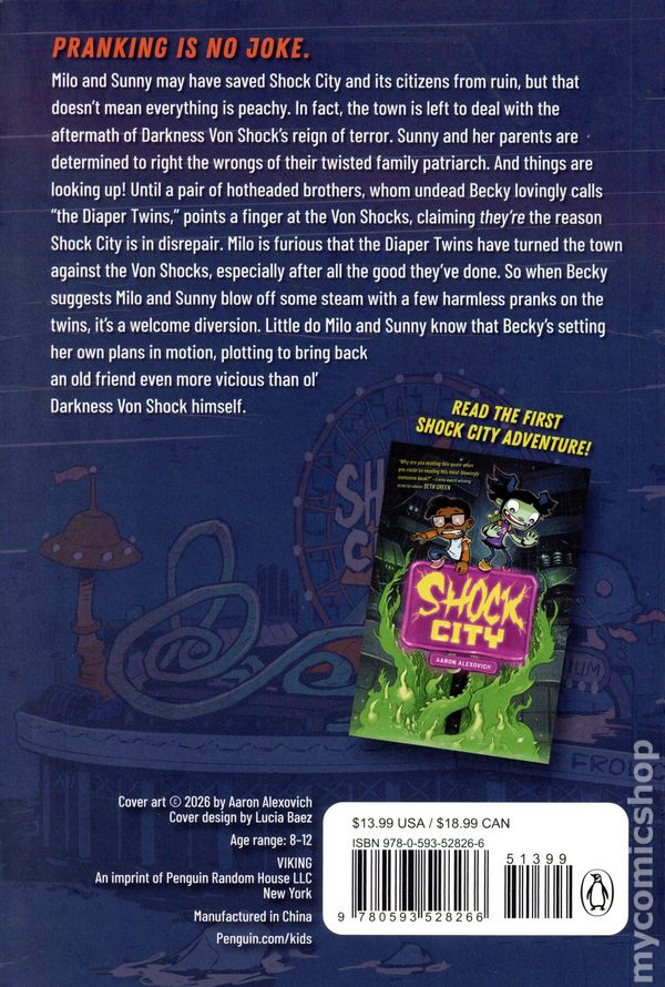 1st printing. Story and art by Aaron Alexovich. The follow-up to the Tim-Burton-esque middle grade graphic novel that Max Brallier calls Equal parts nightmarish and outrageously funny!" Milo and Sunny may have saved Shock City and its citizens from ruin, but that doesn't mean everything is peachy. As the town continues to deal with the aftermath of Darkness Von Shock's reign of terror, a new team of instigators arises: hotheaded brothers who Becky lovingly refers to as the Diaper Twins. They lead the town in blaming Sunny and her parents for all the issues Shock City still faces. Milo is enraged that the Diaper Twins have scapegoated the Von Shocks, but then Becky convinces Milo and Sunny to blow off some steam and play a few harmless pranks on the twins. Little do Milo and Sunny know Becky's setting her own plans in motion, plotting to bring back an old friend even more sinister than ol' Darkness Von Shock himself. Softcover, 5 1/2-in. x 8 1/2-in., 240 pages, full color. Age 8-12 years Cover price $13.99.