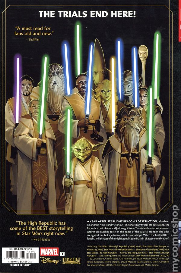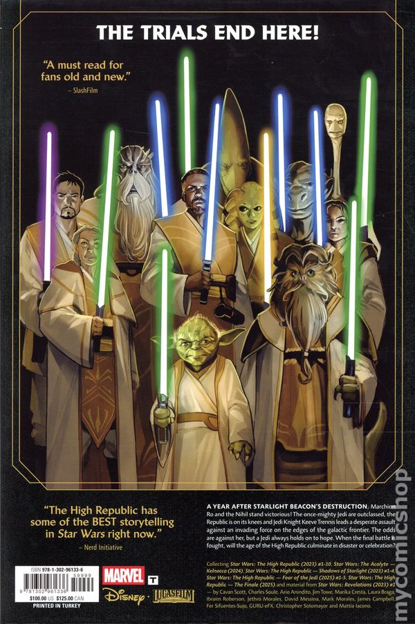 1st printing. Collects Star Wars: The High Republic (2024 Marvel) Phase III #1-10, Star Wars Revelations (2022 Marvel) (High Republic story), Star Wars: The Acolyte Kelnacca (2024 Marvel), Star Wars: The High Republic - Shadows of Starlight (2023 Marvel) #1-4, Star Wars: The High Republic - Fear of the Jedi (2025 Marvel) #1-5, Star Wars: The High Republic the Finale (2025 Marvel) [The Beacon]. Written by Charles Soule and Cavan Scott. Art by Ibraim Roberson, Marika Cresta, Jethro Morales, David Messina, James Towe, Ario Anindito, Mark Morales, and Laura Braga. Cover by Giuseppe Camuncoli. Back Cover by Phil Noto. The acclaimed series reaches its shocking conclusion! A year after Starlight Beacons destruction, Marchion Ro and the Nihil stand victorious! The once-mighty Jedi are outclassed, the Republic is on its knees and Jedi Knight Keeve Trennis leads a desperate assault against an invading force on the edges of the galactic frontier! The odds are stacked against her, but a Jedi always clings to hope. The Force is with her, right? Then the secrets of the year following Starlight Beacons fall are revealed! As fighting within the Nihil Occlusion Zone intensifies, the weary Jedi must face their greatest fear — and when the final battle is fought, the consequences will be grave indeed! Will the High Republic era end in disaster or celebration? Plus: Delve deep into the history of Kelnacca — the lightsaber-wielding Wookiee from the Disney+ series THE ACOLYTE! Hardcover, 8 1/2-in. x 11-in., 528 pages, full color. Rated T Cover price $100.00.