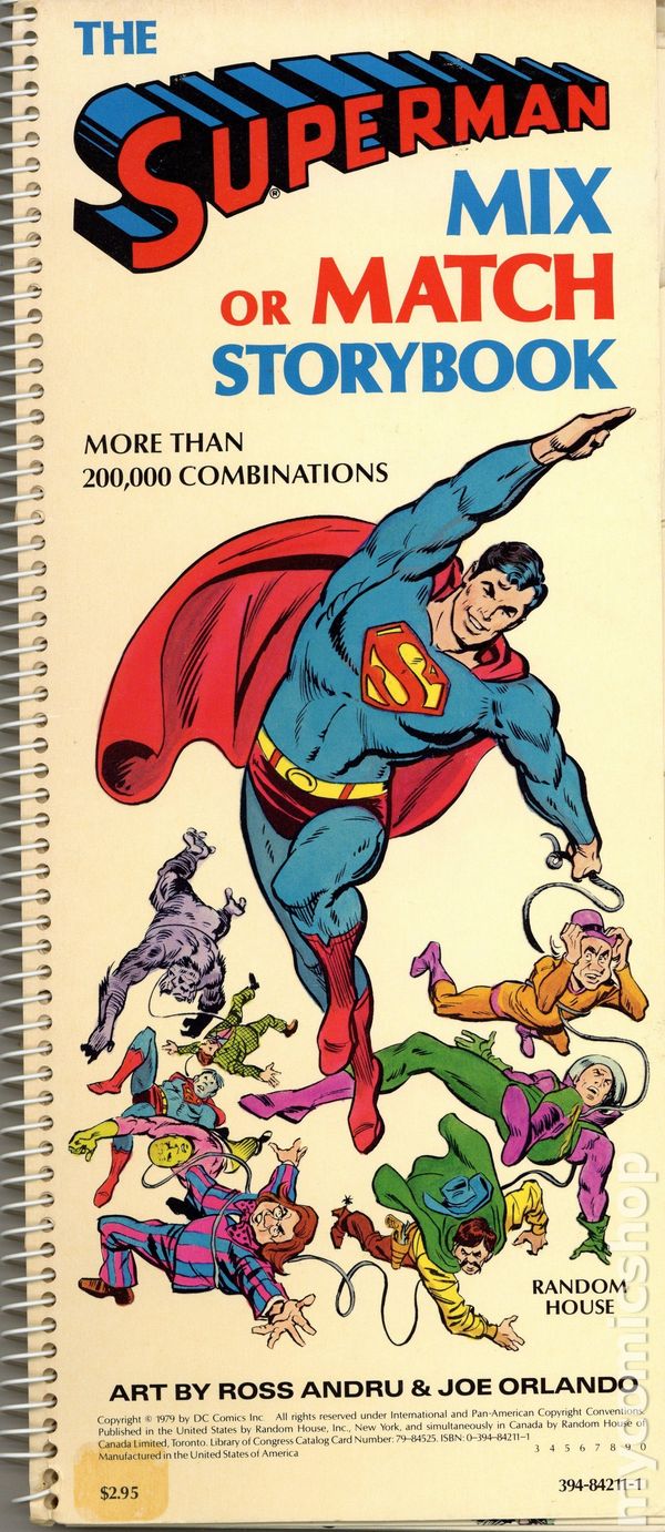 2nd and later printings, cover price may vary. Art by Ross Andru and Joe Orlando. There are eight pages. Each page is separated into six different illustrations (48 illustrations in all) with individual story text. The different pictures can be flipped to create many different stories. The cover boasts, "More than 200,000 Combinations!" Superman must use everything from superbreath to super strength to defeat the likes of Brainiac, Mr. Mxyzptlk, Lex Luthor, Bizarro, and more. Hardcover (Cardstock Spiral-Bound), 5-in. x 12-in., full color. Cover price $2.95.