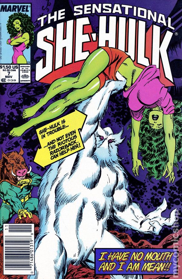 Newsstand Edition. Guest-Starring Razorback and U.S. 1. Hercules cameo. Story by John Byrne. Art by John Byrne and Bob Wiacek. How can She-Hulk possibly defeat the alien creature Xemnu when it can render her unconscious with but a word? Plus, witness She-Hulk's dream hunk...Hercules? Cover price $1.50.