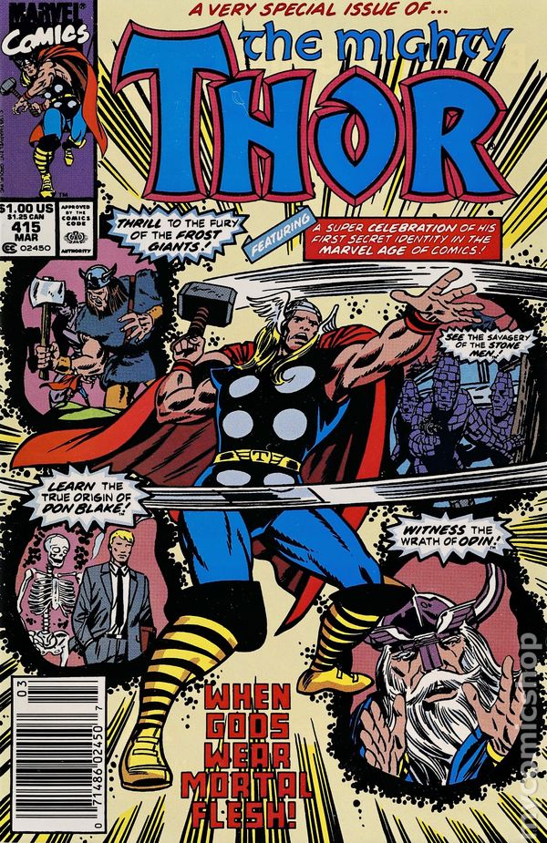 Newsstand Edition. Cover by Herb Trimpe. "When Gods Wear Mortal Flesh!", script by Tom DeFalco, pencils by Herb Trimpe, inks by Herb Trimpe; Eric recalls the memory of Thors first banishment to Earth, in the form of Don Blake. A semi-retrospective on Thor's career, recapping his origin. Hogun stars in a Tales of Asgard back-up story, script by Tom DeFalco, art by Herb Trimpe; Hogun teachs Dagal that the way of the warrior is not a nice one. Bullpen Bulletins. 36 pgs., full color. $1.00. Cover price $1.00.