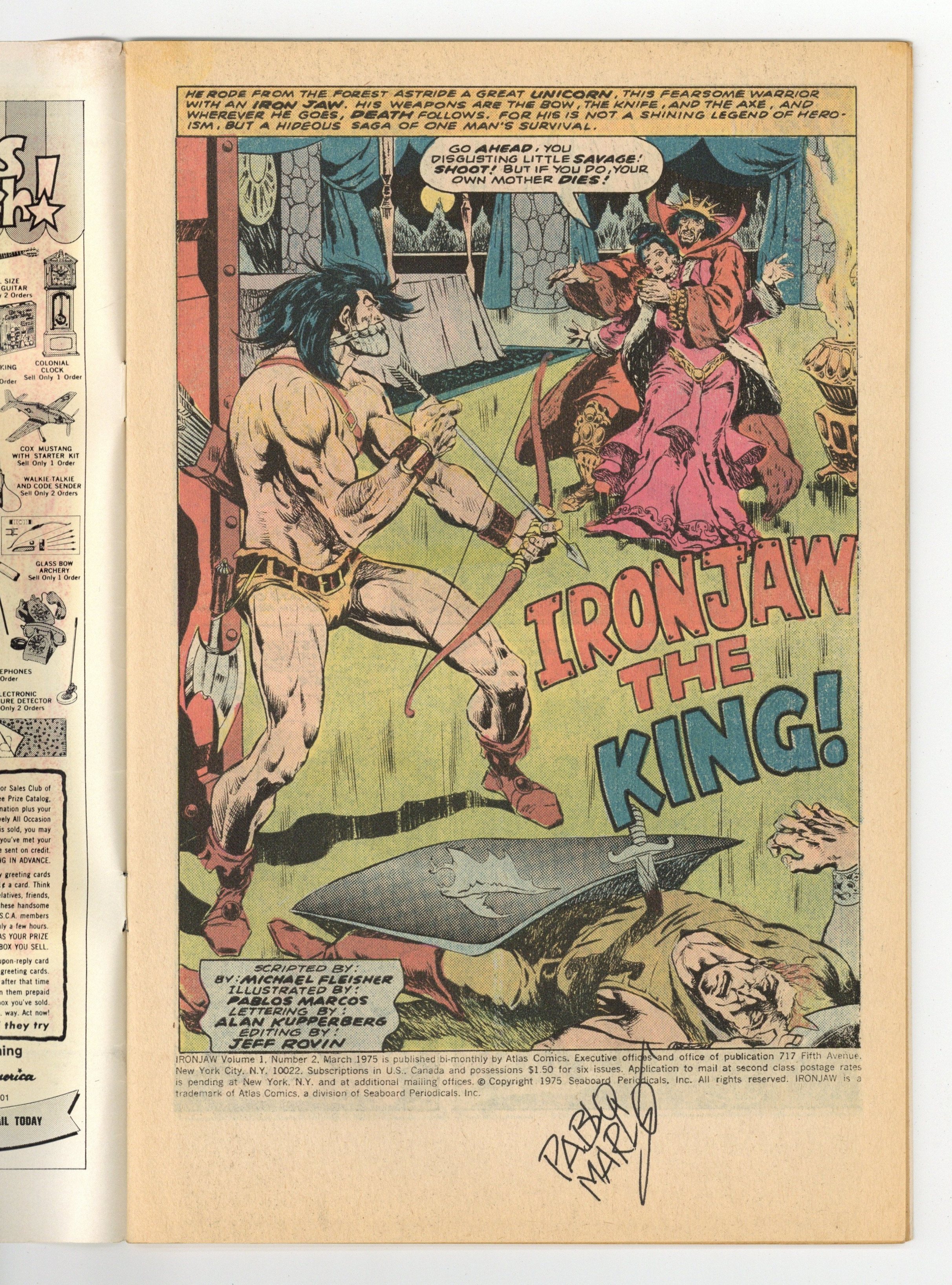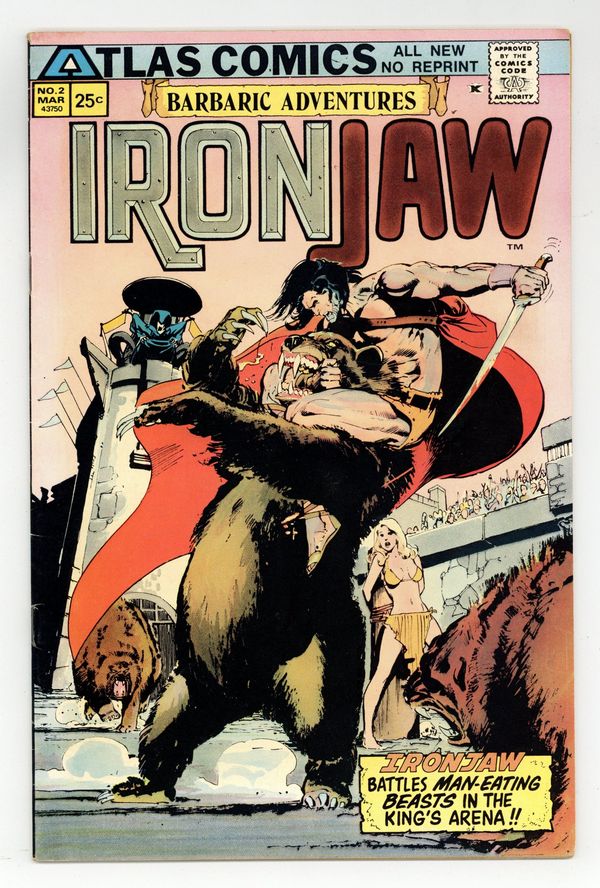 Starts Feb 16 After escaping from a gladiatorial arena, Ironjaw discovers his true heritage as king of his post-apocalyptic world. He sets out to overthrow the usurper king and regain his throne. Part of the short-lived Atlas line from former Marvel publisher Martin Goodman. Written by Michael Fleisher, with art by Pablo Marcos. 32 pages. Cover price $0.25.