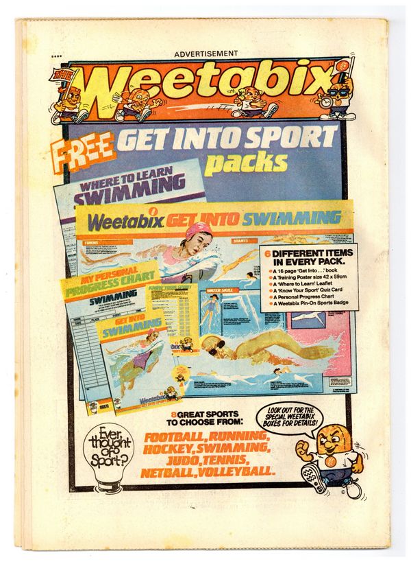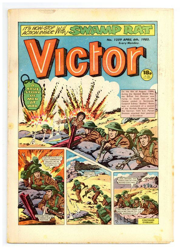Published Apr 1985 by D.C. Thomson & Co..$6.70April 6, 1985. Published by D.C. Thompson and Co. Ltd. in Great Britain. Action/adventure stories feature the Quest of the Last Six Hundred, Johnny Gurkha, the Punch Pirate, Morgyn the Mighty, Legion of the Lost, Duke Farlow, Taneebo the Thunderbolt, and more. 8.5 x 11.75; black and white; 32 pages; 18p cover price.