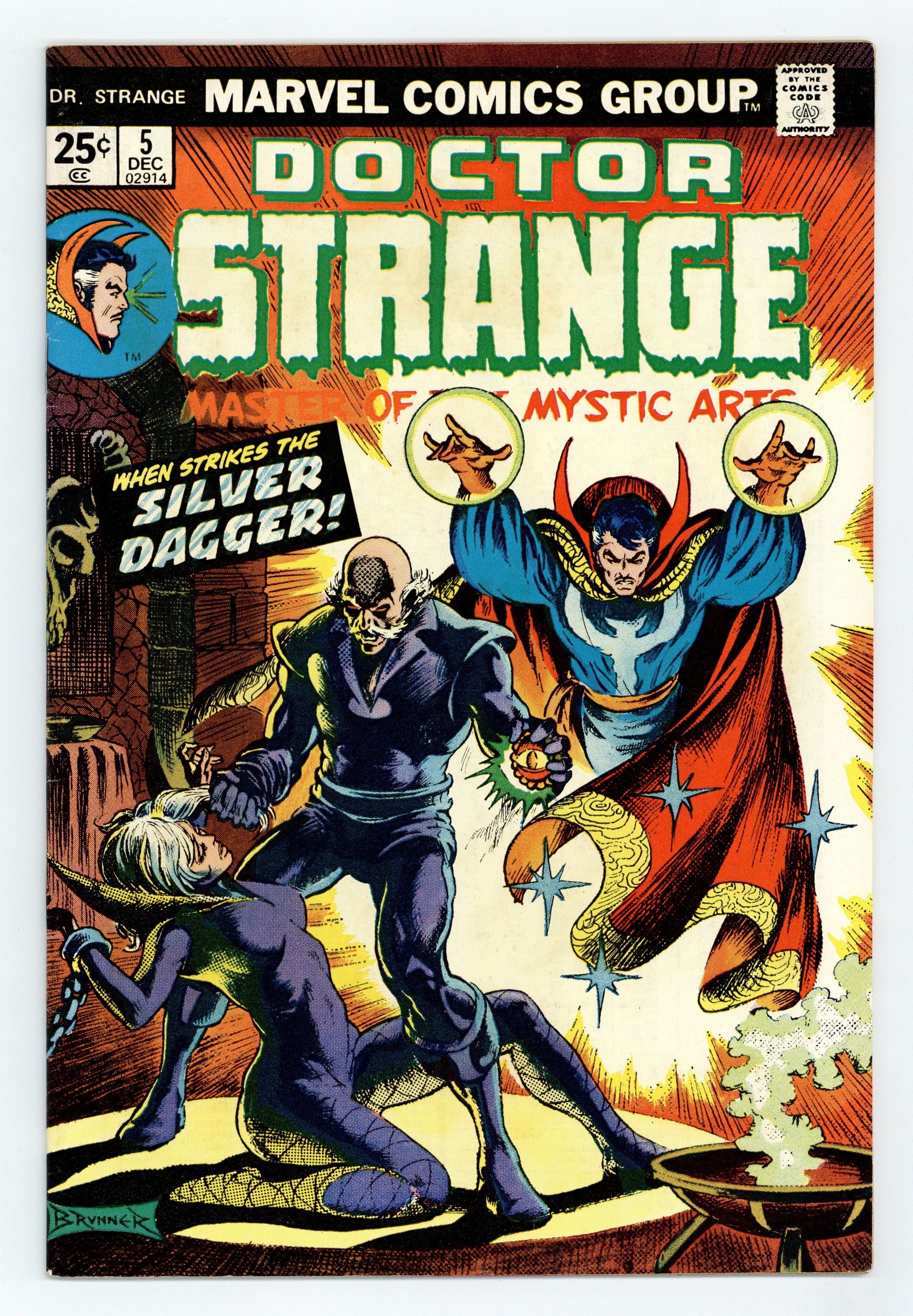 Cover art by Frank Brunner. A Separate Reality!, script by Steve Englehart, pencils by Frank Brunner, inks by Dick Giordano; Strange battles the Soul-Eater; Tea party at the White Queen's (Valkyrie) castle, with Silver Surfer, Hulk, Sub-Mariner, Hawkeye, Spider-Man, Black Panther, Nick Fury, Ant-Man...Green Lantern?!; First appearance of the Knights of the Rostrum [unreal versions of Spider-Man, the Defenders (the Silver Surfer, the Sub-Mariner, the Hulk), Hawkeye, Nick Fury, the Black Panther, Ant-Man, and Captain Midnight] and the White Queen (an unreal version of the Valkyrie); Silver Dagger appearance. Considered an unofficial Crossover due to gloved hand wearing Green Lantern Ring on page 16 Cover price $0.25.