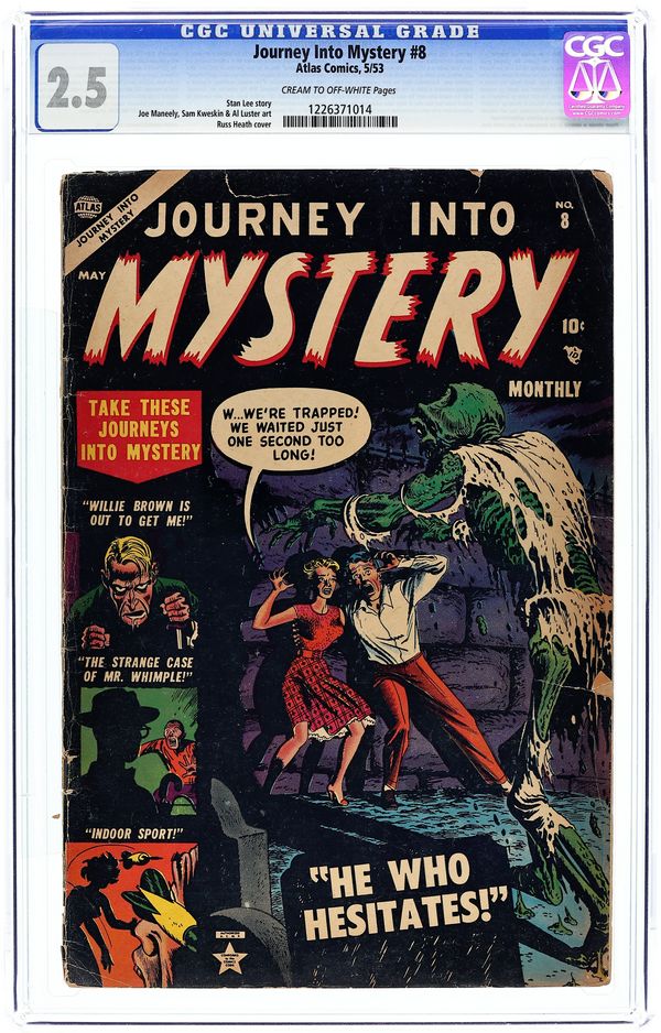 Cover by Russ Heath. "The Tough Guy," script by Stan Lee, art by Joe Maneely; A muscleman gets pistol whipped and winds up in the hospital; He overhears a conversation between two doctors about a serum that toughens the body so he decides to take it and turn to crime with his powerful body. "Indoor Sport!," art by Sam Kweskin; A female ghost acquires pictures of men from potential suitors and throws darts into them to inflict pain and death upon the men in revenge for a man who once jilted her. "Willie Brown Is Out to Get Me!," script by Stan Lee, art by Al Luster; People tell a thug that Willie Brown is after him, which terrifies him, since he shot Willie Brown a week ago and he is now a zombie. "Time Reversal" text story. "He Who Hesitates...," art by Al Eadeh; A hesitant professor finally decides to kill the romeo who's moving in on his wife, but as usual, he waits a little too long and the other man pushes him off the cliff instead so that he can marry the professor's wife. "The Strange Case of Mr. Whimple!," art by Fred Kida; A thief attacks a man who always carries a box around on his shoulder with a blackjack and kills him. 36 pgs., full color. $0.10. Cover price $0.10.