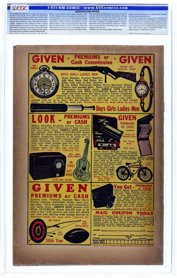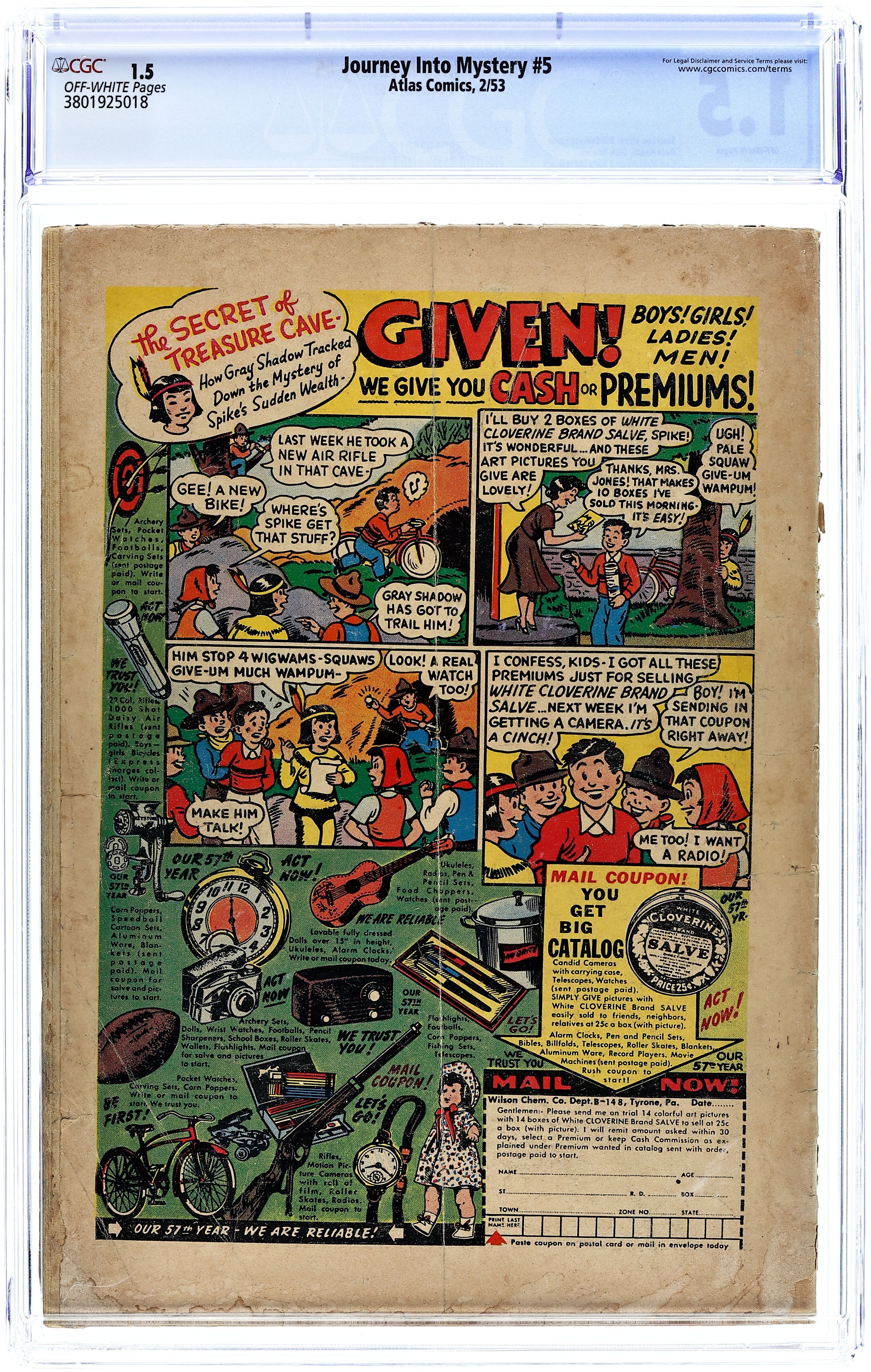 Cover by Harry Anderson. "Vampire Tale," art by Doug Wildey; A man wrapped in bandages is on trial for murder after slaying a vampire. "The Curse" text story. "Man Alone!," art by Al Eadeh; Communists get the idea to swap a spy for the village idiot in a centrally located village by taking a hermit and training him to pass for the idiot. "The Man Who Wasn't," art by Bill Walton; A man invents a youth serum and wishes to give it to the oldest member of an old folks home, but the man doesn't want it. "The Vultures," art by Mannie Banks; Unknown to his children, a man leaves his estate to the ones who attend his funeral. "The Question!," art by Vic Carrabotta; An inventor who loves his wife asks an electronic brain which he devised two questions, 'When will my wife die?' and 'When will I die?' 36 pgs., full color. $0.10. Cover price $0.10.