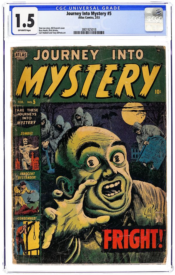 Cover by Bill Everett. "Fright," script by Stan Lee, art by Russ Heath; A cruel asylum keeper is drugged by his assistant as he and the asylum keeper's wife wish to marry. "The Big Shoes" text story. "Zombie!," art by Tony DiPreta; In a Haitian village, a criminal named Blackie becomes afraid for his life when a man named Larson he framed for a crime has learned how to raise the dead and control the reanimated corpses as zombies; After a close brush with death when fighting off the zombie, Blackie decides to go and learn how to raise a zombie himself. "Condemned!," art by Carl Hubbell. "Innocent Bystander," art by Dick Briefer; A woman buys an antique statue that murders her in her sleep. 36 pgs., full color. $0.10. Cover price $0.10.