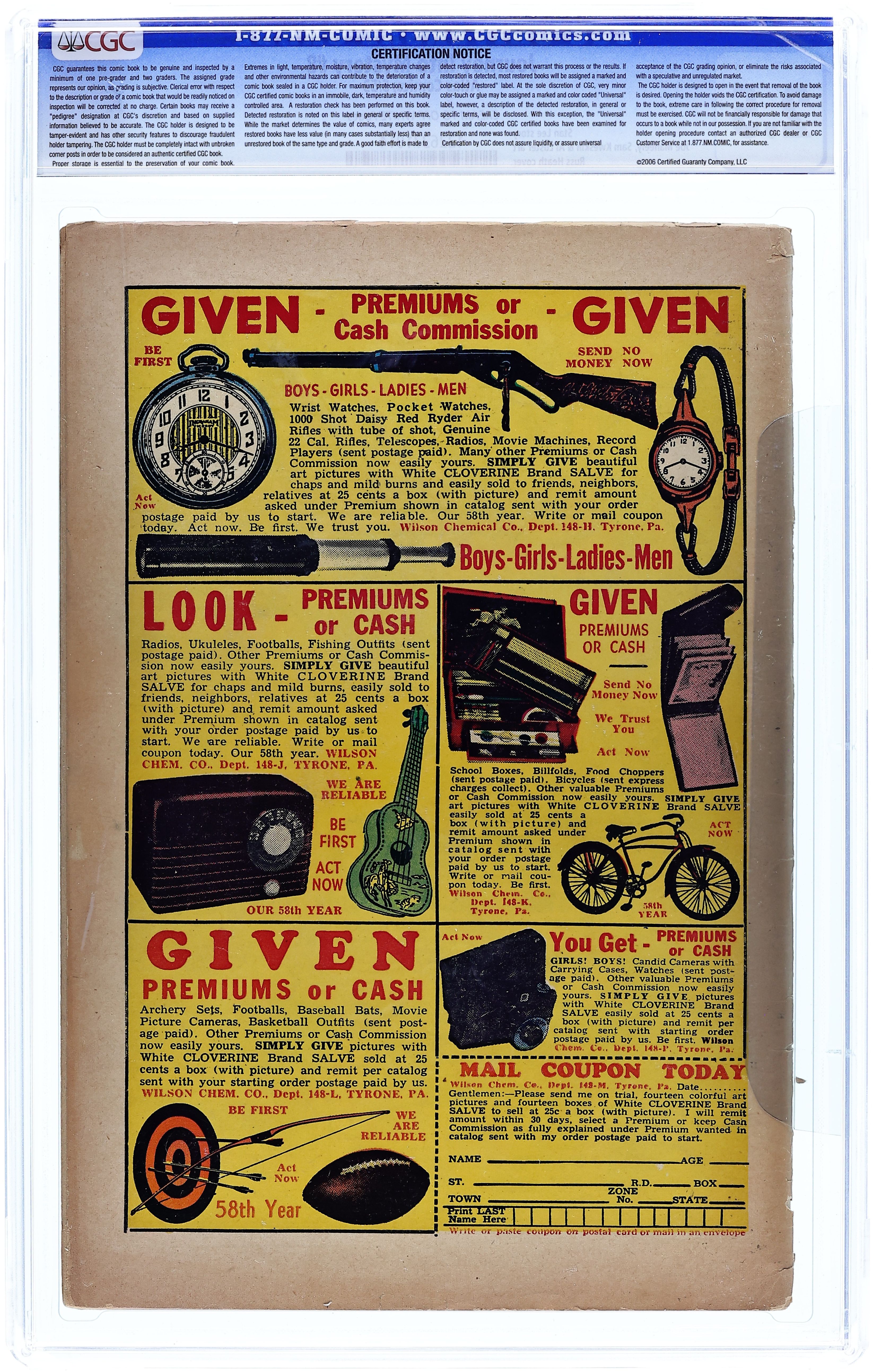 Beast of Bedlam; a man fights for his soul against the forces of evil from out of the past. Miser in the Coffin; millionaire Thaddeus Crewe decides to take his wealth with him to the grave. The Missing Man text story. Terror in the Night. Blood on Her Lips; a man of the Royal Northwest Mounted Police braves winter climes to try and capture a trapper wanted for murder. Circus Toys and Big Top ad. 36 pgs. $0.10. Cover price $0.10.
