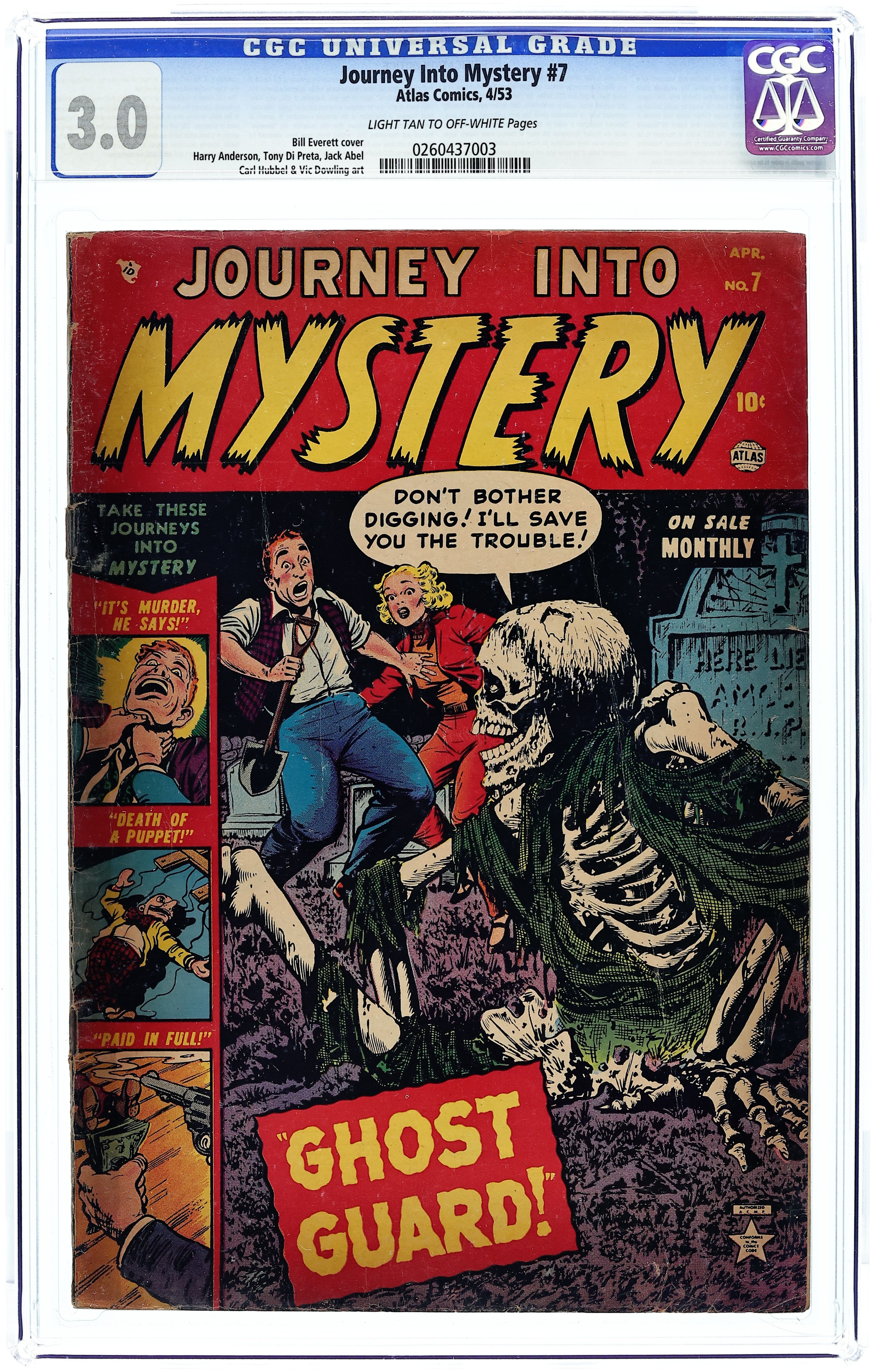 Cover by Bill Everett. "Death!," script by Stan Lee, art by Russ Heath; When a scientist reanimates the body of a murder victim he has freshly killed in order to learn what death is like, his victim shows him by strangling him. "The Experiment" text story, art by Paul Reinman. "Wings of the Vampire!," script by Stan Lee, art by Ed Winiarski; A European village inspector thinks he is safe from the town vampire by locking himself inside the jail, but it turns out that is the vampire's hideout. "The Perfect Specimen!," art by Tony DiPreta; When a recruiting station tests what appears to be the perfect recruit they are surprised the x-ray results reveal him to be a robot. "The Man Who Went Back," script by Carl Wessler, art by Sam Kweskin; An escaped killer, due to be hanged, gets on a bus that moves forward in time so that the passengers age rapidly. "Till Death Do Us Part!," script by Carl Wessler, art by Mort Lawrence; A man who murders his wives for their money hooks up with a woman who just murders her husbands for kicks. 36 pgs., full color. $0.10. Cover price $0.10.