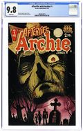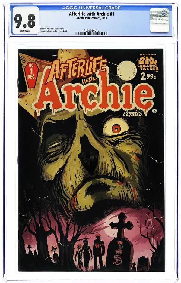 Cover by Francesco Francavilla. Written by Roberto Aguirre Sacasa. Art by Francesco Francavilla and Jack Morelli. New Ongoing Series! 'Escape From Riverdale.' This is how the end of the world begins! Harvey Award-winning writer Roberto Aguirre-Sacasa (Archie Meets Glee) and Eisner-winning artist Francesco Francavilla (Batman) take Archie and the gang where they've never been before - to the grave and back! A horrific accident sets off a series of grim events and Sabrina the Teenage Witch must try to repair the unspeakable evil her spell has unleashed. Gasp in horror as Riverdale faces an impending zombie Arch-pocalypse in this brand-new, spine-tingling ongoing series - but be warned, kiddies, this one's not for the faint of heart! Cover price $2.99.