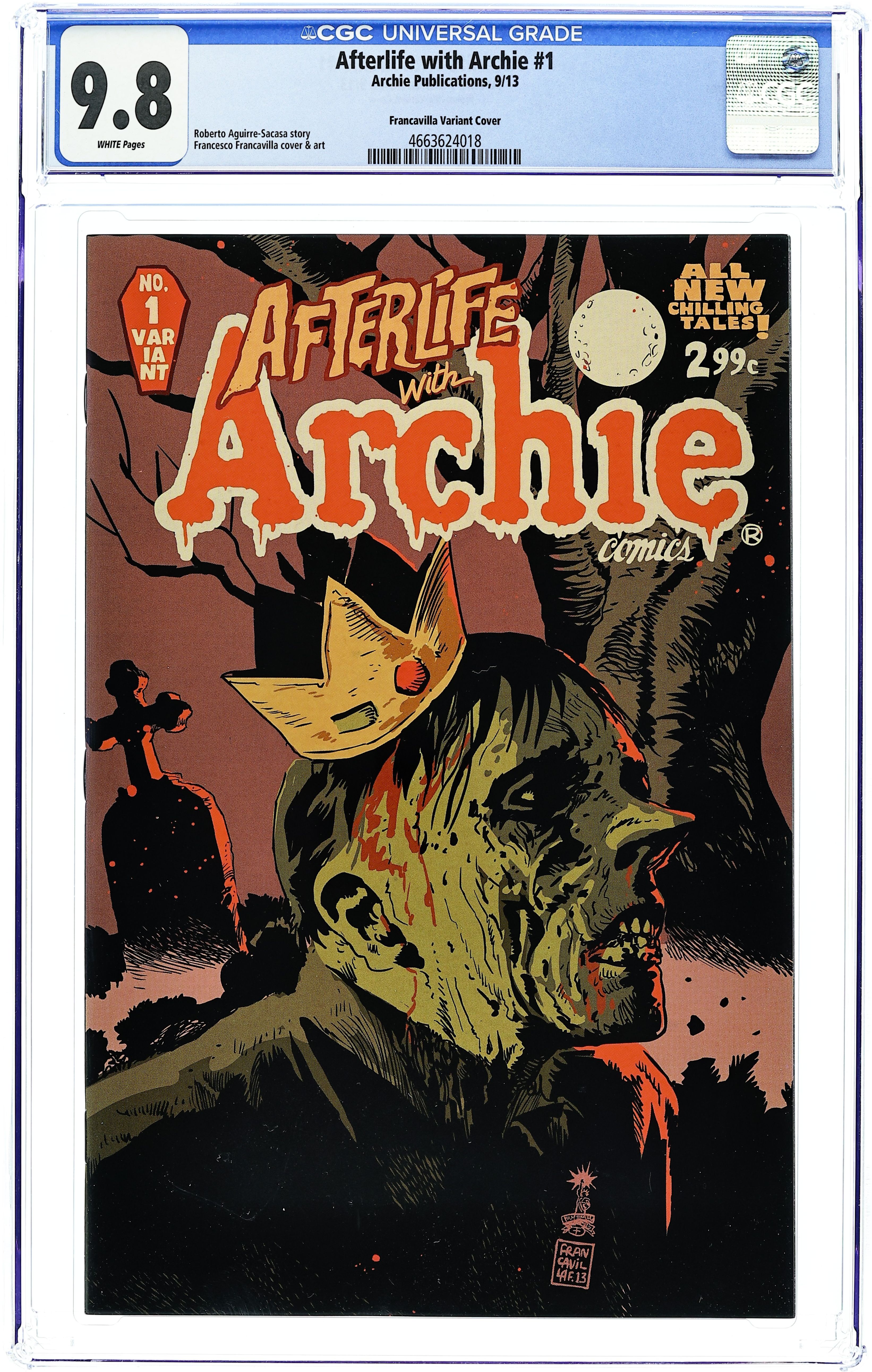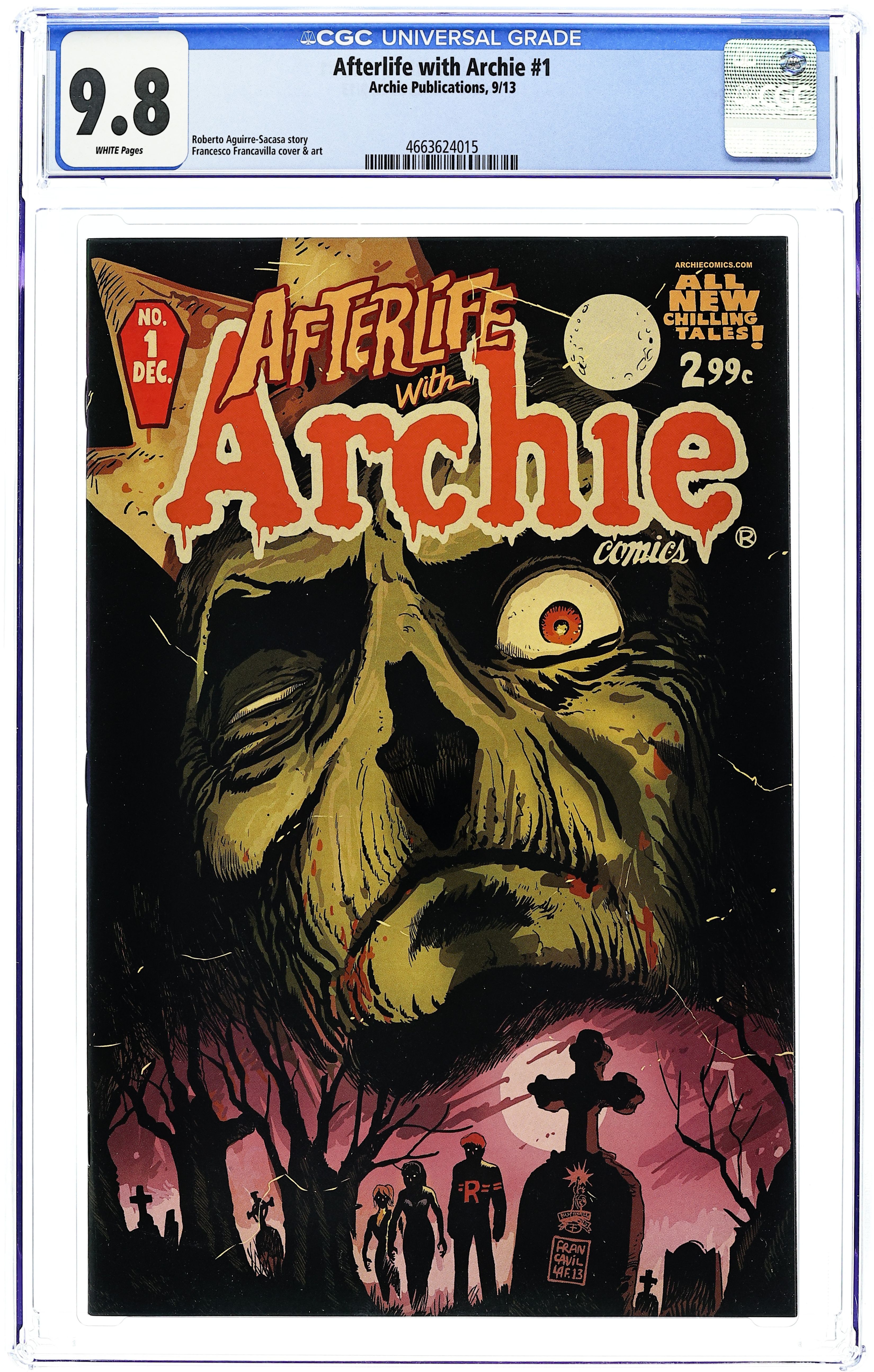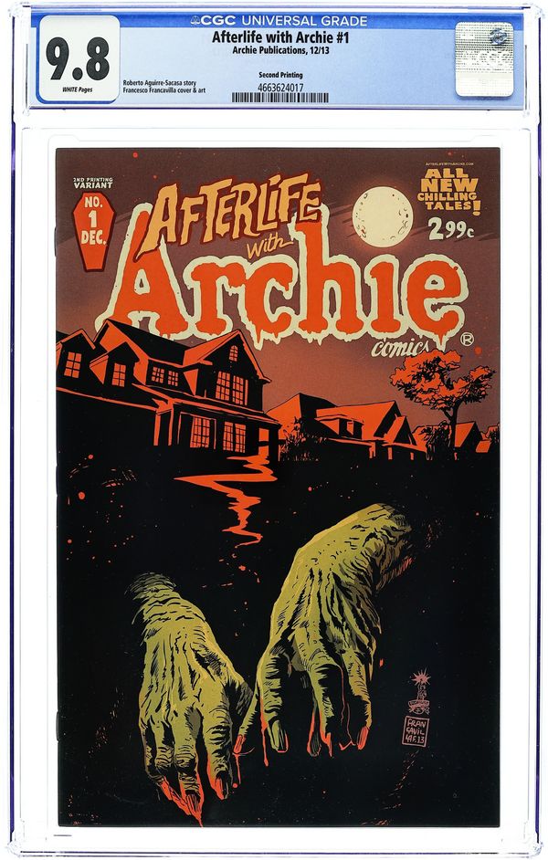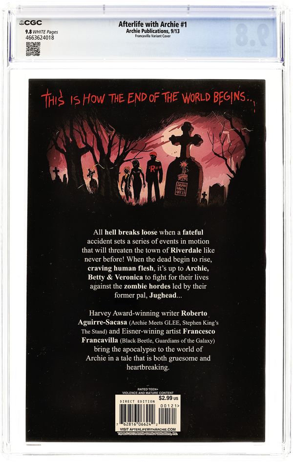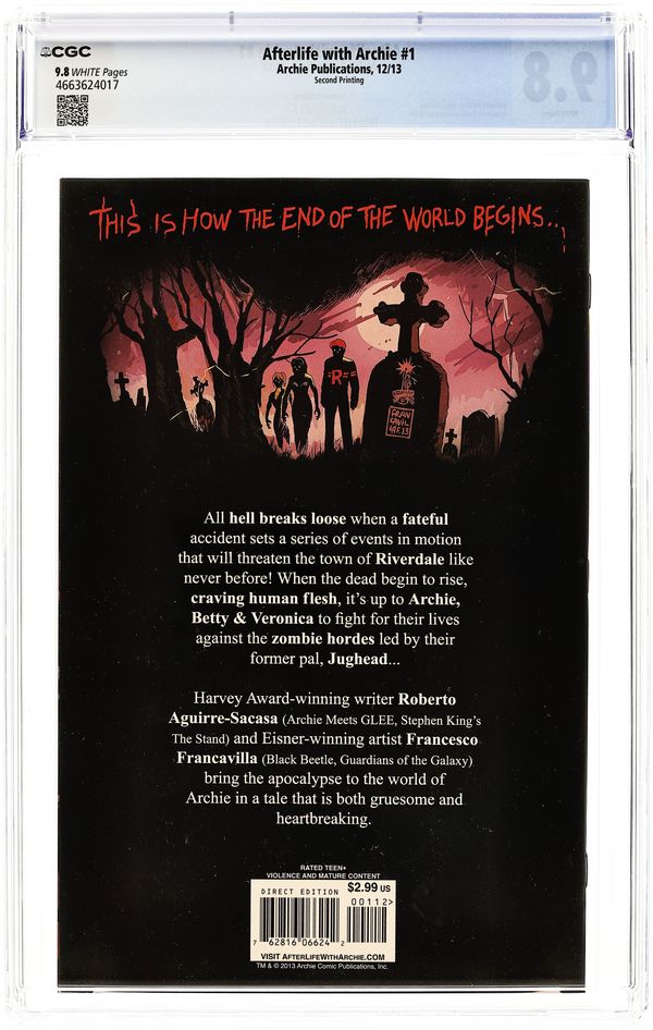 SECOND PRINTING Cover by Francesco Francavilla. Written by Roberto Aguirre Sacasa. Art by Francesco Francavilla and Jack Morelli. New Ongoing Series! 'Escape From Riverdale.' This is how the end of the world begins! Harvey Award-winning writer Roberto Aguirre-Sacasa (Archie Meets Glee) and Eisner-winning artist Francesco Francavilla (Batman) take Archie and the gang where they've never been before - to the grave and back! A horrific accident sets off a series of grim events and Sabrina the Teenage Witch must try to repair the unspeakable evil her spell has unleashed. Gasp in horror as Riverdale faces an impending zombie Arch-pocalypse in this brand-new, spine-tingling ongoing series - but be warned, kiddies, this one's not for the faint of heart! Cover price $2.99.