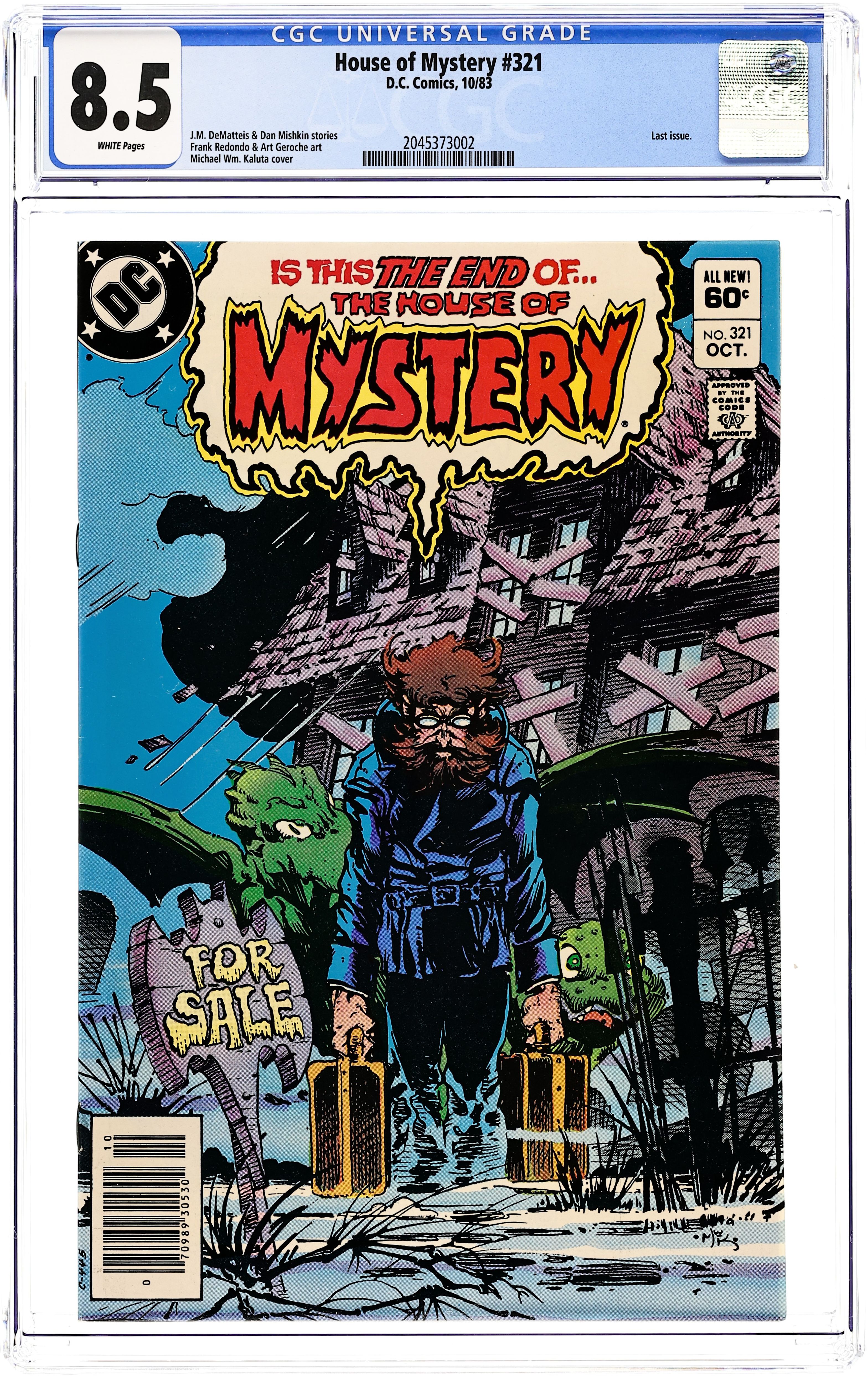 Newsstand Edition. Cover by Mike Kaluta. Featuring: 9 page House of Mystery framing sequence "This Property Is Condemned!" starring Cain, Karen Berger, Joe Orlando, Gregory the Gargoyle, Brad the Doorman, Gary Cohn (cameo) and Dan Mishkin (cameo), written by Dan Mishkin & Gary Cohn and drawn by Adrian Gonzales; 8 page story "Government Vampire" written by J.M. DeMatteis and drawn by Frank Redondo; 1 page I... Baby Vampire! story by Stephen DeStefano; 4 page story "Can't Wait to Get Off Work" written by Dan Mishkin & Gary Cohn and drawn by Art Geroche; 1 page story "I Am a Middle-Aged Werewolf!" by Stephen DeStefano. 36 Pages, Full Color. Cover price $0.60.