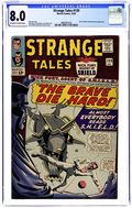 Cover art by Bill Everett. Nick Fury stars in "The Power of SHIELD!", script by Stan Lee and Jack Kirby (co-plot), pencils by Jack Kirby (layouts) and Jim Steranko, inks by Jim Steranko; Fury signals SHIELD but after Sitwell realizes Fury is the pilot he still orders the launching of a Strato-Mine which could ignite the atmosphere; Supreme Hydra learns that Laura Brown, the daughter of his predecessor who helped Fury has been captured in Egypt; Donning a new disguise he leaves to exact punishment; Fury turns the plane around, and, discovering the hidden Overkill Horn, dives from the plane, picked up by a SHIELD submarine. "Into the Dimension of Death!", script by Stan Lee and Bill Everett (co-plot), art by Bill Everett; Doctor Strange finds himself once more in The Dark Dimension, the home of Dormammu & Clea; After facing several dangers, he senses the power of a woman behind it all; Umar uses a pair of cloudy "spirits" to summon Strange to her presence; She tells him of her imprisonment, and that she wishes to "make amends" for her brother's deeds; She also tells him that Clea has been captured by The Mindless Ones, and that she summoned him as the one Clea hoped would rescue her. 36 pgs., full color. Cover price $0.12.
