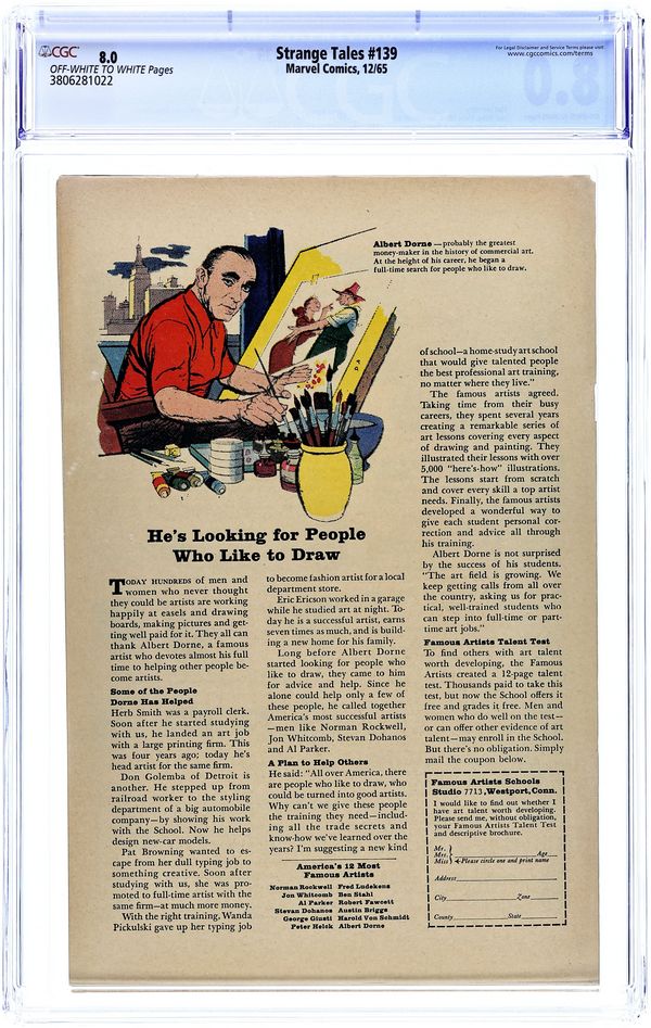 Cover pencils by Jack Kirby, inks by Frank Giacoia. The Human Torch and the Thing star in "The Challenge of...The Watcher!", script by Stan Lee and Bob Powell (co-plot), pencils by Bob Powell, inks by Wally Wood; Though he is not permitted to interfere, The Watcher tells Ben & Johnny of how Kang time-travelled to the days of King Arthur, imprisoned Merlin, and took over the country; In order for the time stream to remain intact, The Watcher sends the pair back in time to defeat Kang; Cameos by Sue Storm and Reed Richards. "Earth Be My Battleground," script by Steve Ditko (plot) and Stan Lee (dialogue), art by Steve Ditko; Dr. Strange returns to earth but remains in hiding. Mordo's spirits discover Strange and pursue him; Meanwhile Clea distracts Dormammu by freeing The Mindless Ones; They attack, causing Dormammu to leave Mordo on his own. Strange flies into space and straight into the sun, the spirits fleeing and Mordo worried that it might spell his doom; Strange returns to The Ancient One, who in his weak, delirious condition, speaks of "Eternity"; Appearance by Clea. 36 pgs., full color. Cover price $0.12.
