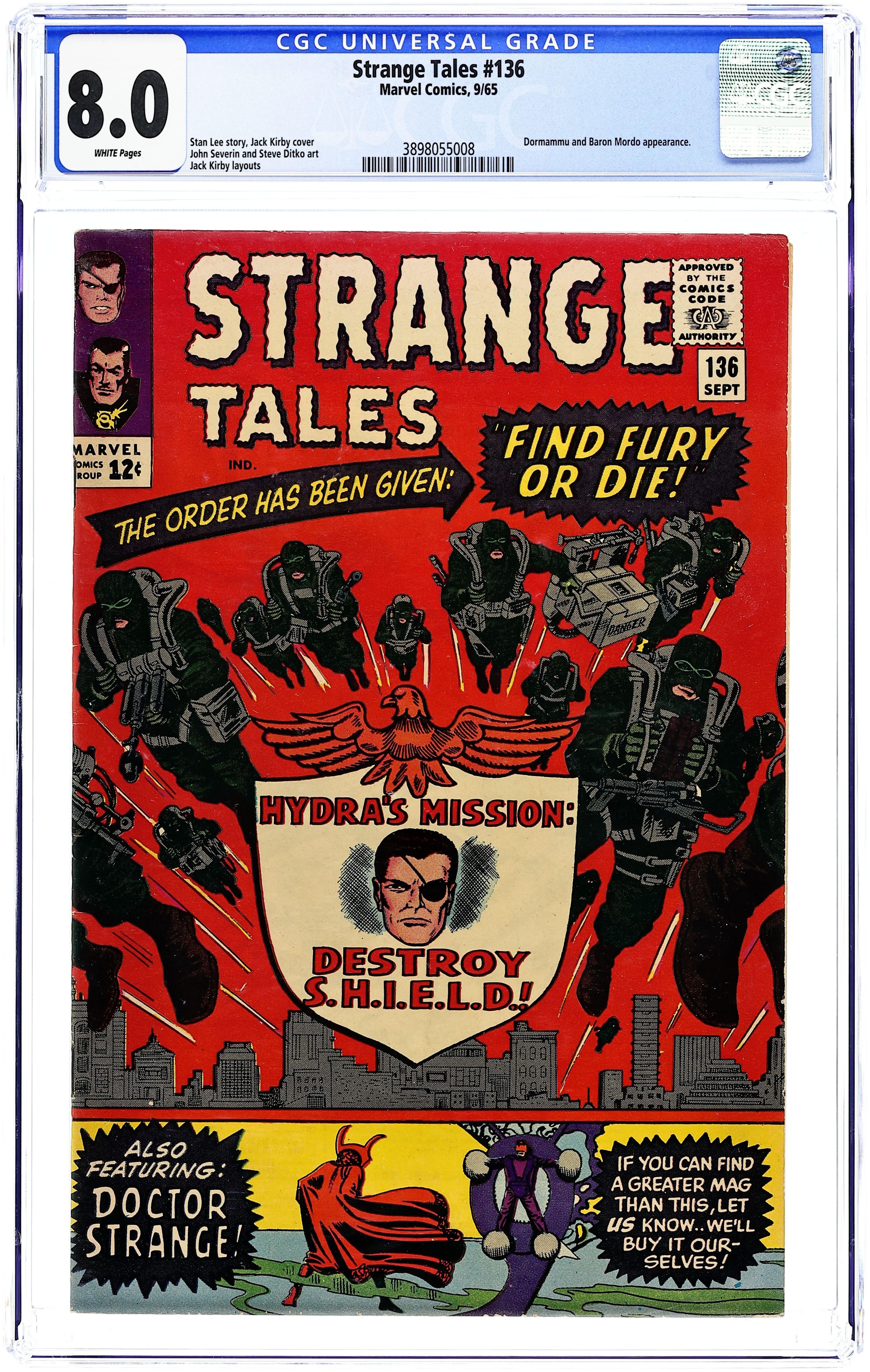Cover pencils by Jack Kirby and Steve Ditko (bottom tier), inks by Mike Esposito and Steve Ditko (bottom tier). "Find Fury or Die!", script by Stan Lee and Jack Kirby (co-plot), pencils by Jack Kirby (layouts) and John Severin, inks by John Severin; HYDRA agents tail Fury intent on finding SHIELD's HQ, but Fury is aware he's being followed. HYDRA Section Leader B, a "Hydra-Hunter," runs the mission and hands over his hood to the Imperial Hydra so he will have no place to hide should he fail; When a few HYDRA agents show up at the barber shop which is the secret entrance to SHIELD's HQ, they're captured and hypnotized into believing the HQ is located in a warehouse blocks away. "What Lurks Beneath the Mask?", script by Steve Ditko (plot) and Stan Lee (dialogue), art by Steve Ditko; Dormammu imprisons Clea, telling her she will witness Strange's defeat. Mordo tells Dormammu that Strange is searching for "Eternity" and is puzzled by the dark lord's violent reaction; Strange continues his search, going from one mystic to another with no results, until The Aged Genghis tells him only he and The Ancient One know the secret; He gives him a scroll, which leads Strange to a being imprisoned in another dimension; a trap he barely escapes. 36 pgs., full color. Cover price $0.12.