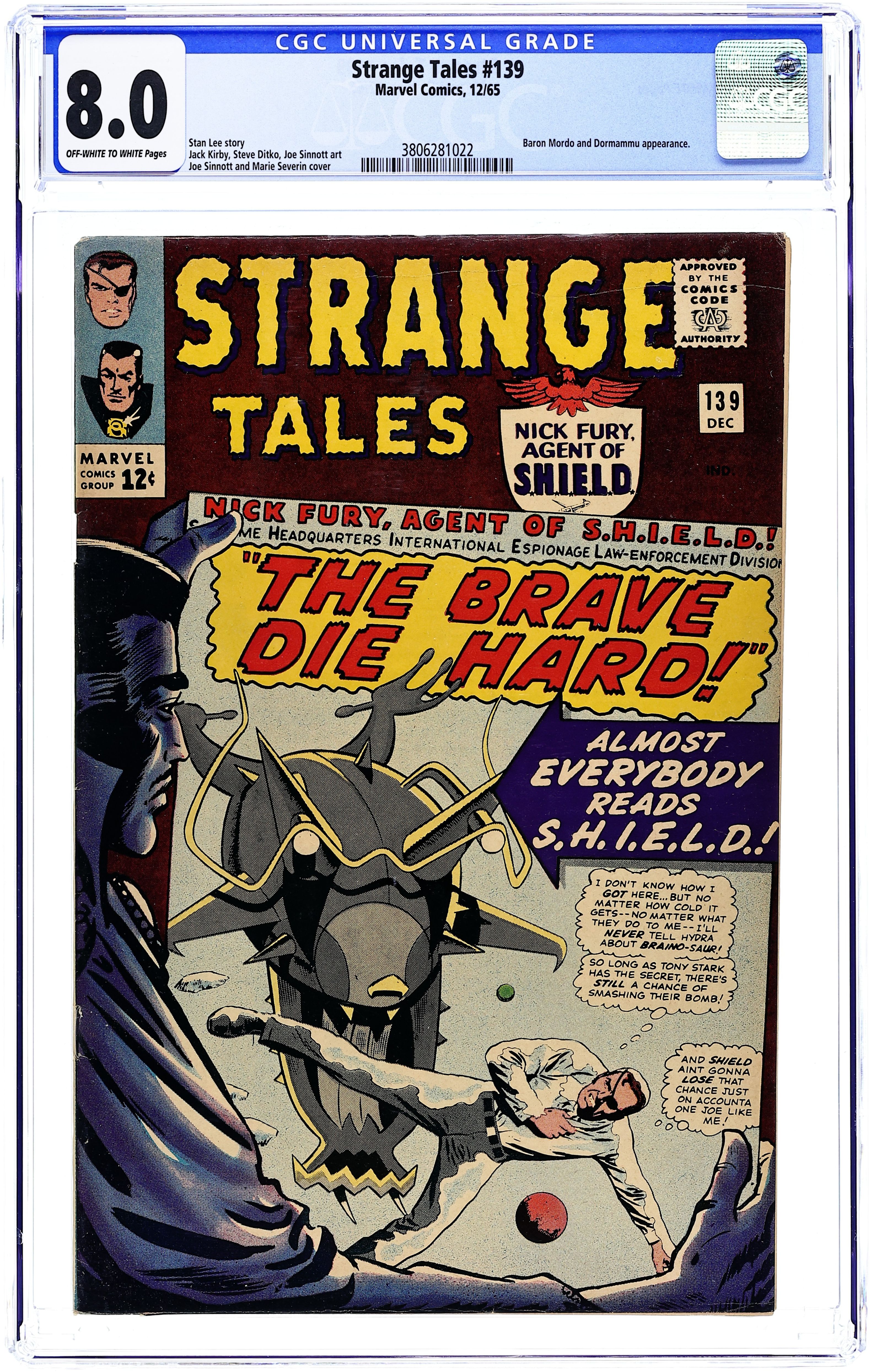 Cover pencils by Jack Kirby, inks by Frank Giacoia. "The Man for the Job!", script by Stan Lee and Jack Kirby (co-plot), pencils by Jack Kirby, inks by Dick Ayers; Nick Fury reports to the Pentagon, encountering Life Model Decoys: replicas of himself; He is driven in a gadget-filled car that converts to flying mode; Fury learns about SHIELD, an international organization whose job is to stop HYDRA, fanatics bent on world domination; Fury meets Tony Stark, in charge of SHIELD's weaponry, who tells Fury he was chosen to lead SHIELD. "Eternity Beckons!", script by Steve Ditko (plot) and Stan Lee (dialogue), art by Steve Ditko; In London, seeking info on "Eternity," Dr. Strange goes to the secluded home of Sir Baskerville, a former disciple of Mordo's, who greets him as an old friend; Meanwhile, Dormammu discovers that Clea set the Mindless Ones free and swears she will pay for her betrayal; Baskerville contacts Mordo, who sends an emissary to trap Strange but it backfires, allowing Strange to discover that Dormammu is the one behind Mordo's attacks and increased power. Notes: 1st S.H.I.E.L.D., 1st Hydra, 1st Nick Fury as agent of shield, 1st appearance of LMD (Life Model Decoy). 36 pgs., full color. Cover price $0.12.