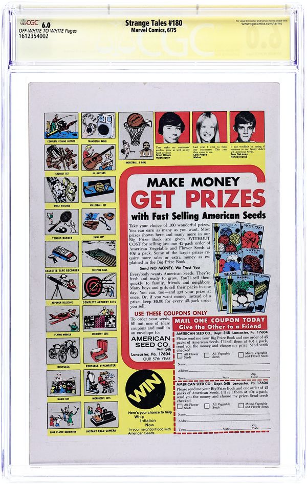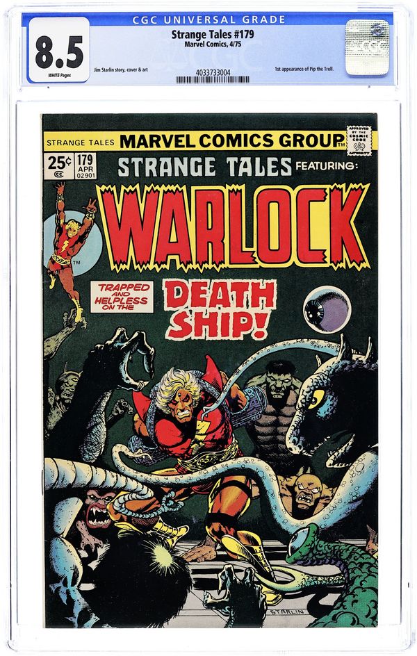 Ends Mar 2 9:29 PM CST Bid History 4 bids Current Bid $20 Your Secret Max Bid If you'd like to bid, please log in or register. Cover art by Jim Starlin. "Death Ship!", script and art by Jim Starlin; Warlock is captured by Autolycus of the Black Knights an brought aboard Magus' Flagship; His fellow prisoners tell Warlock, that survivors of the Wars of the Church are taken as slave laborers, those who refuse will be terminated and their remains will be chemically broken down and valuable elements that can be retrieved will be used to further the cause of the Church; They also tell him, that Non-Humanoids are not considered fashioned in the Magus' image and thus must be disposed of, this also holds true for some Humanoid types—such as Trolls; First appearance of Pip the Troll. 36 pgs., full color. Cover price $0.25.