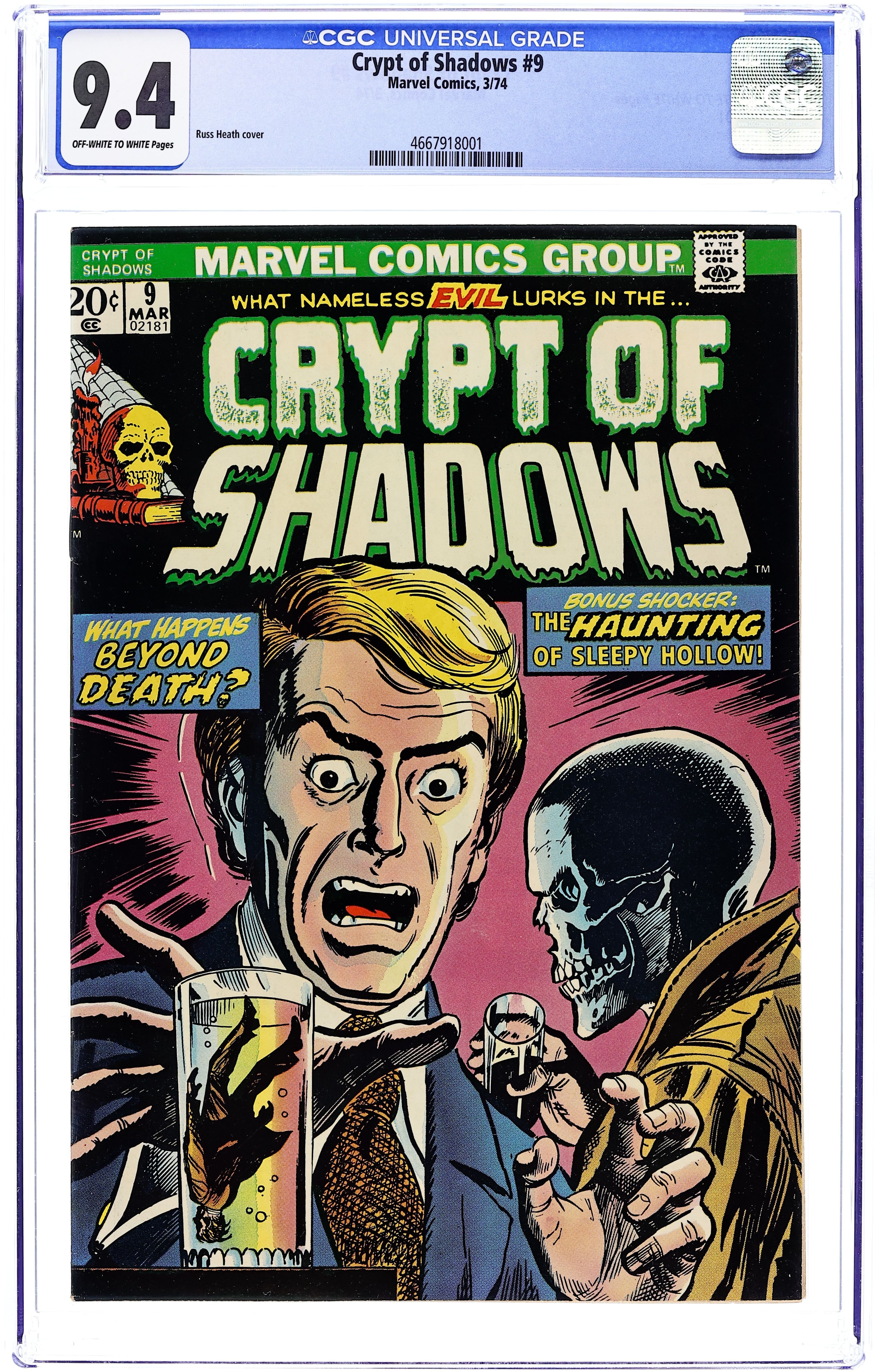 Last 20-cent issue. Cover art by Russ Heath and Mike Esposito (alterations). All reprints: The Haunting of Sleepy Hollow! (from Uncanny Tales 22), pencils by Dick Ayers, inks by Ernie Bache; A man tries to get rid of his rival by frightening him as the Headless Horseman, but the other guy has the same idea and succeeds in getting his rival committed to an asylum. Tomorrow! (from Marvel Tales 138); A man is offered a job by a strange organization that gives him glasses that can see 24 hours into the future, and he must report all accidents he sees so that they can be averted. Beyond Death! (from Mystic 30), art by Chuck Winter. 36 pgs. $0.20. Cover price $0.20.