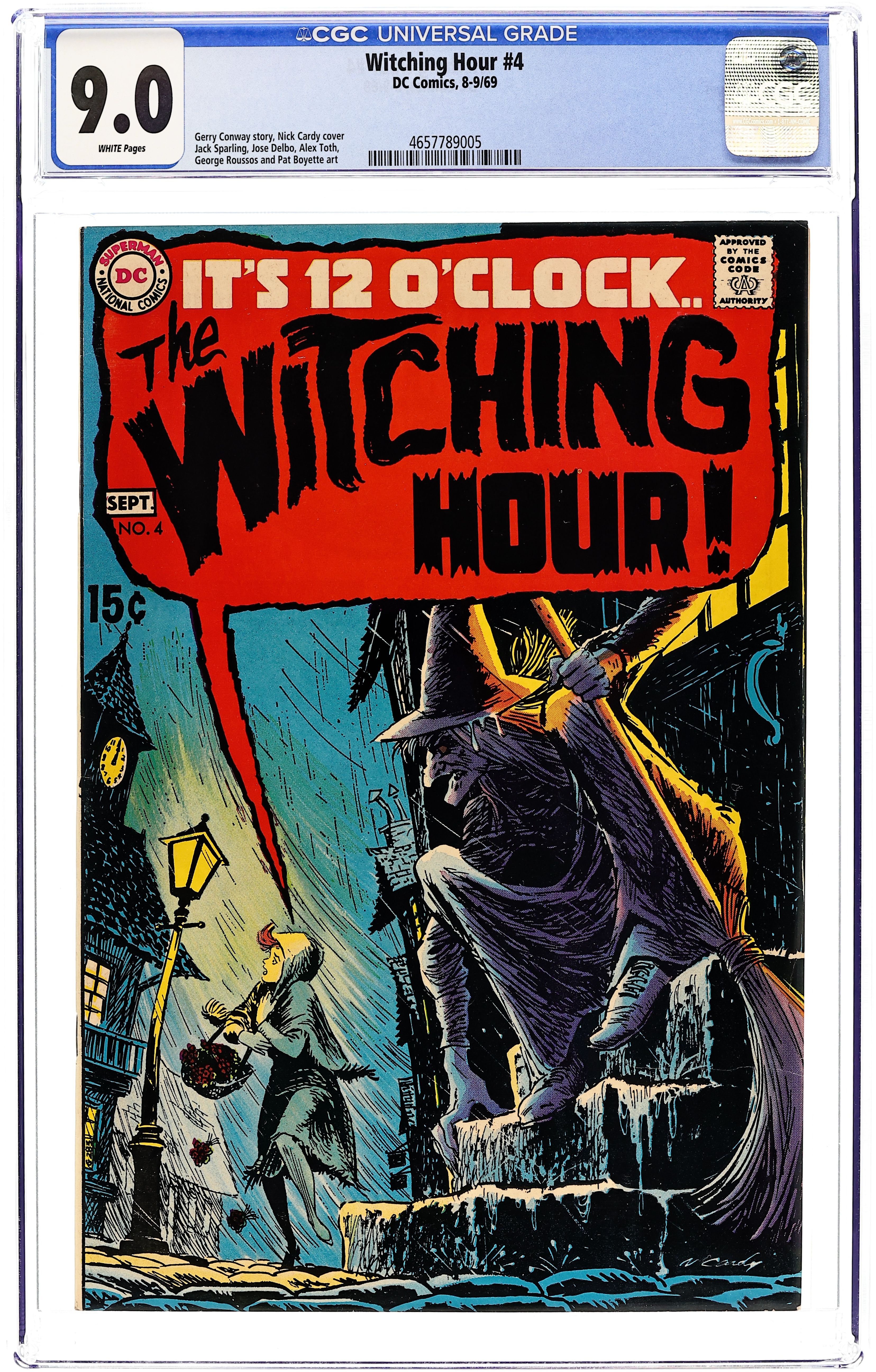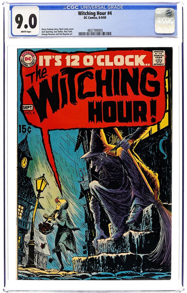 52-page giant. Featuring: 1 page The Witching Hour introductory story starring Cynthia, Mildred and Mordred, drawn by George Tuska; 9 page story "This Little Witch Went to College" written by George Kashdan and pencilled by Don Heck; 7 page reprint story "Fingers of Fear!" drawn by Carmine Infantino and Joe Giella; 7 page reprint story "The Second Life of Simon Steele" drawn by Howard Sherman; 4 page story "The Corpse Who Carried Cash!" written by Bill Dennehy and drawn by John Calnan & Vince Colletta; 8 page story "The Man in the Cellar" written by Carl Wessler and drawn by Jerry Grandenetti. Cover by Nick Cardy. 52 Pages, Full Color. Cover price $0.25.