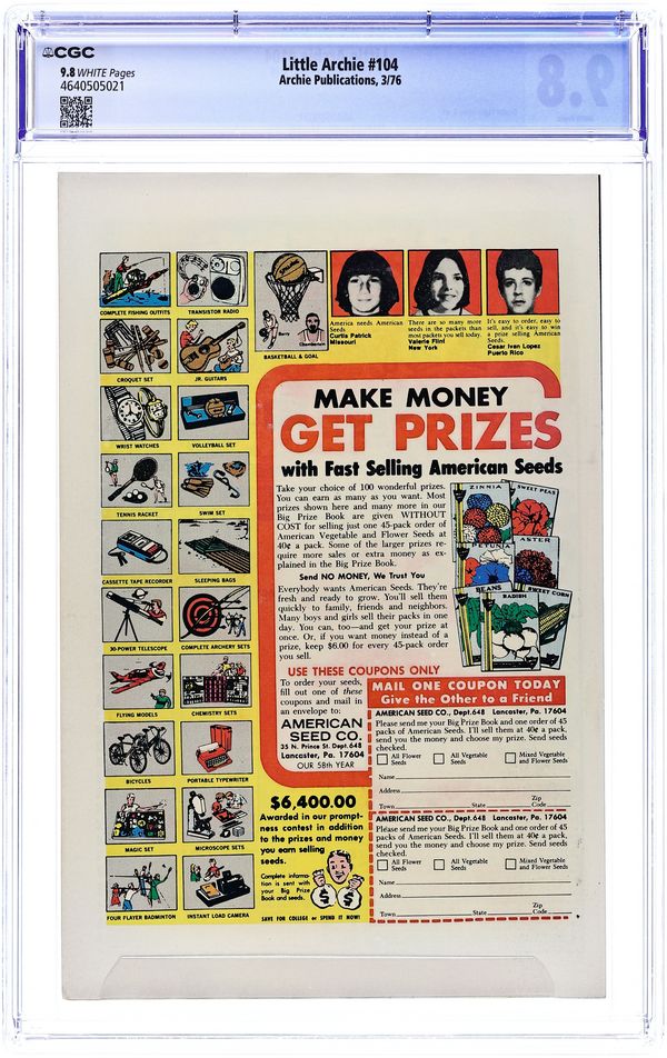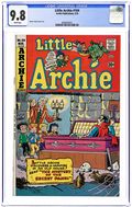 First appearance of Little Archie. Cover pencils by Bob Bolling, inks by Bob White. Hunting; After Archie's mom asks him to stop playing hunter inside the house, he and his friends go outside to hunt wild animals, and come upon a snapping turtle. Racing; Archie builds an "imported Italian sports racer" for the soapbox derby. Playing House; Archie and Ronnie play house and fight even more than real married couples; Betty tries to get in on the act by marrying her cat to Archie's dog. Troops; General Archie and Sergeant Moose try to prevent Ronnie from joining their army, but she gains the troops' loyalty with her "secret orders." Script and pencils for all stories by Bob Bolling, inks by Bob White. 36 pgs. $0.10. Cover price $0.10.