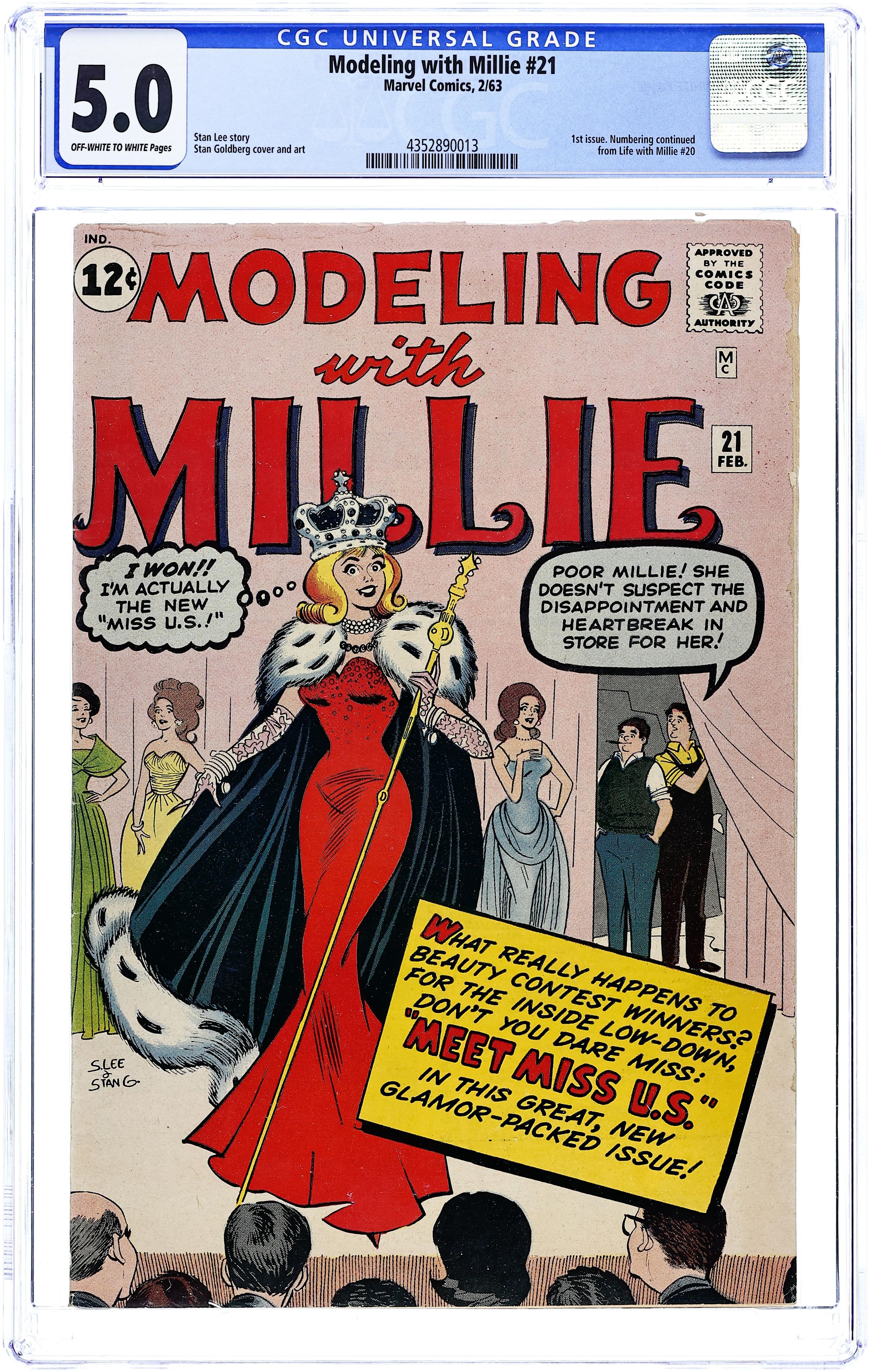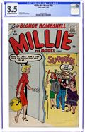 Cover pencils by Stan Goldberg. Meet Miss U.S., script by Stan Lee, pencils by Stan Goldberg; Millie and Chili enter the Miss U.S. beauty contest and Millie wins in spite of Chili's attempt to disqualify her. The Right Man for Me text story, art by Tom Scheuer. Millie's Fashion Pin-Up paper doll page, script by Stan Lee, pencils by Stan Goldberg. Millie's Fanciest Frocks fashion page, script by Stan Lee, pencils by Stan Goldberg. Millie's Love Lesson, script by Stan Lee, pencils by Stan Goldberg; Millie gives Reginald some advice about dealing with Chili. Millie and Chili Become Has-Beens!, script by Stan Lee, pencils by Stan Goldberg; Millie and Chili are fired as models for the Toothy Toothpaste campaign, until sales drop so low that the company is forced to hire them back. 36 pgs. $0.12. Cover price $0.12.