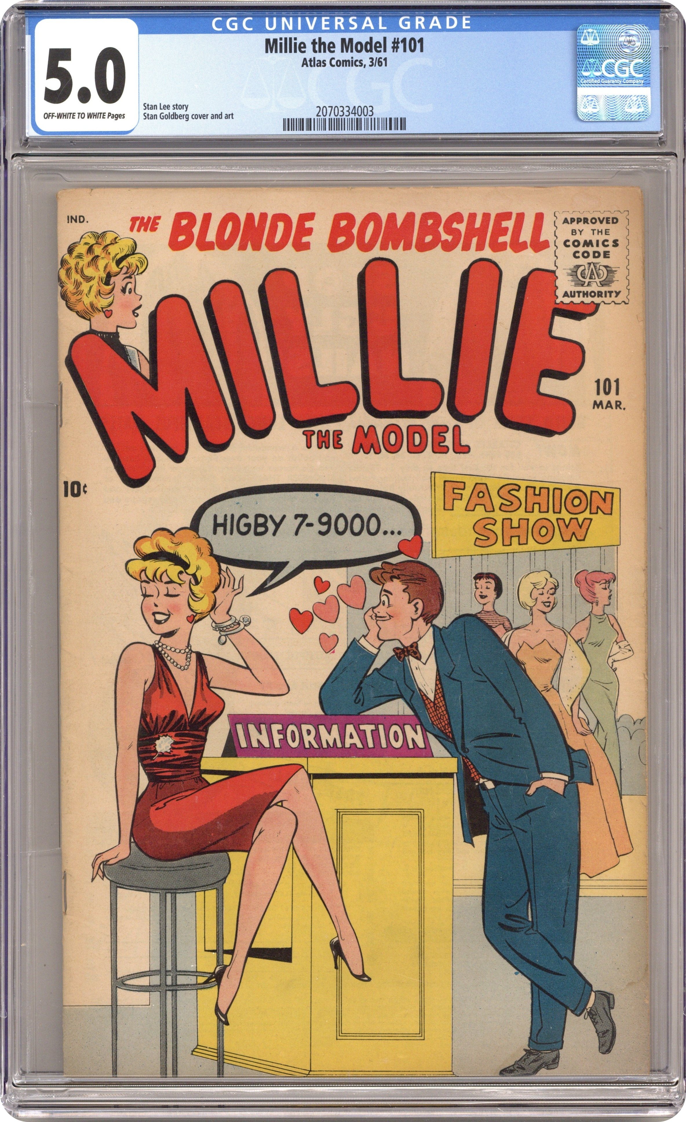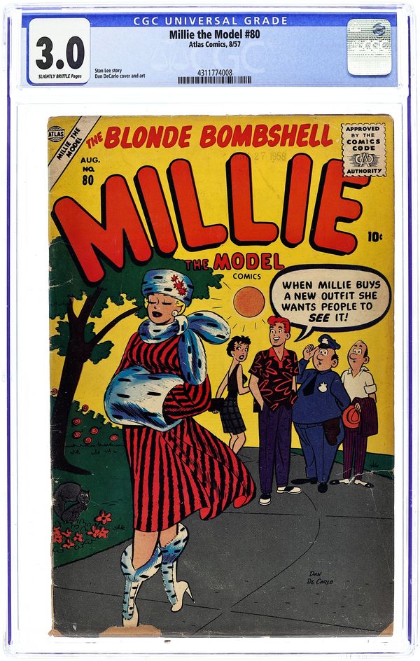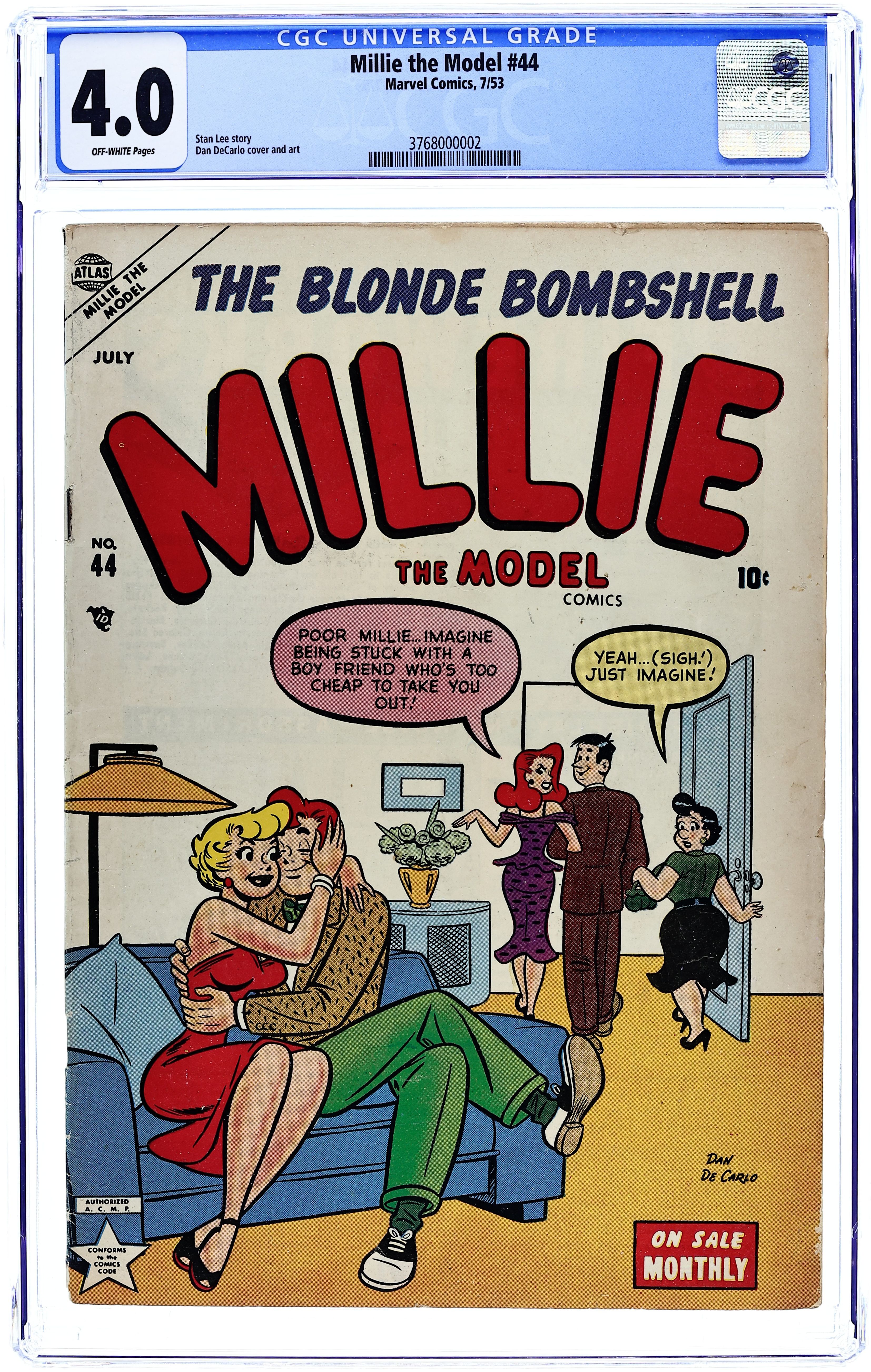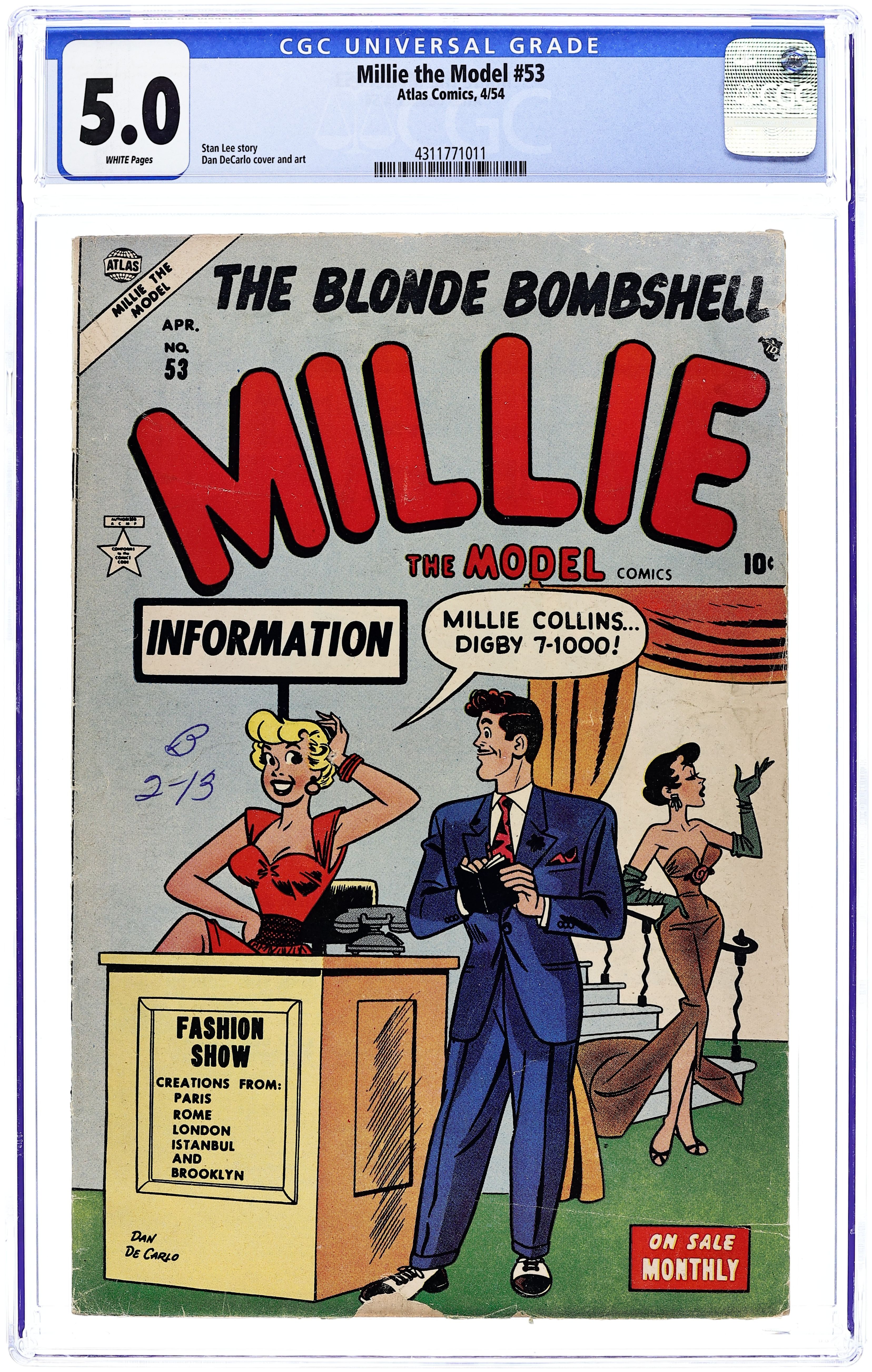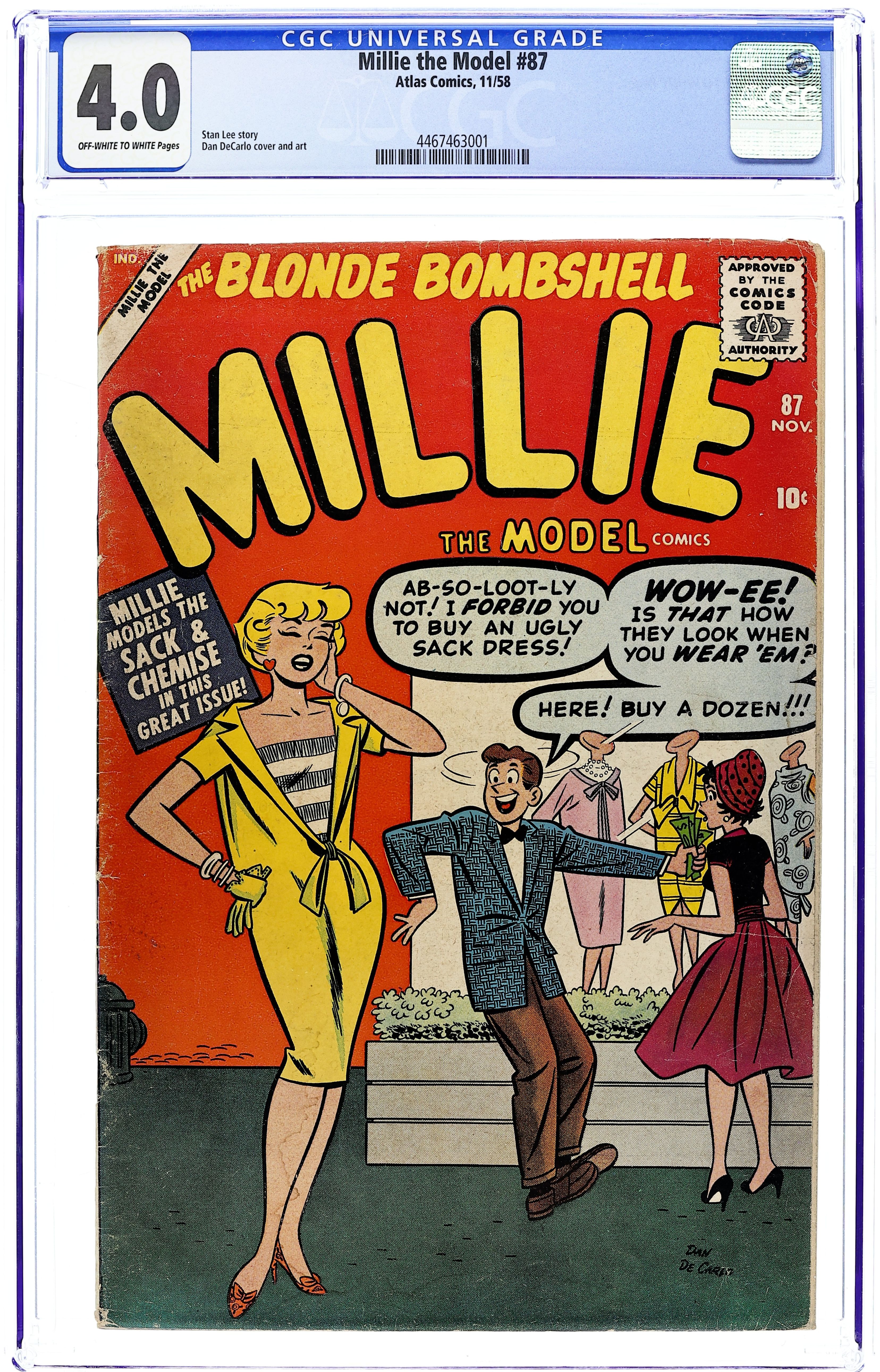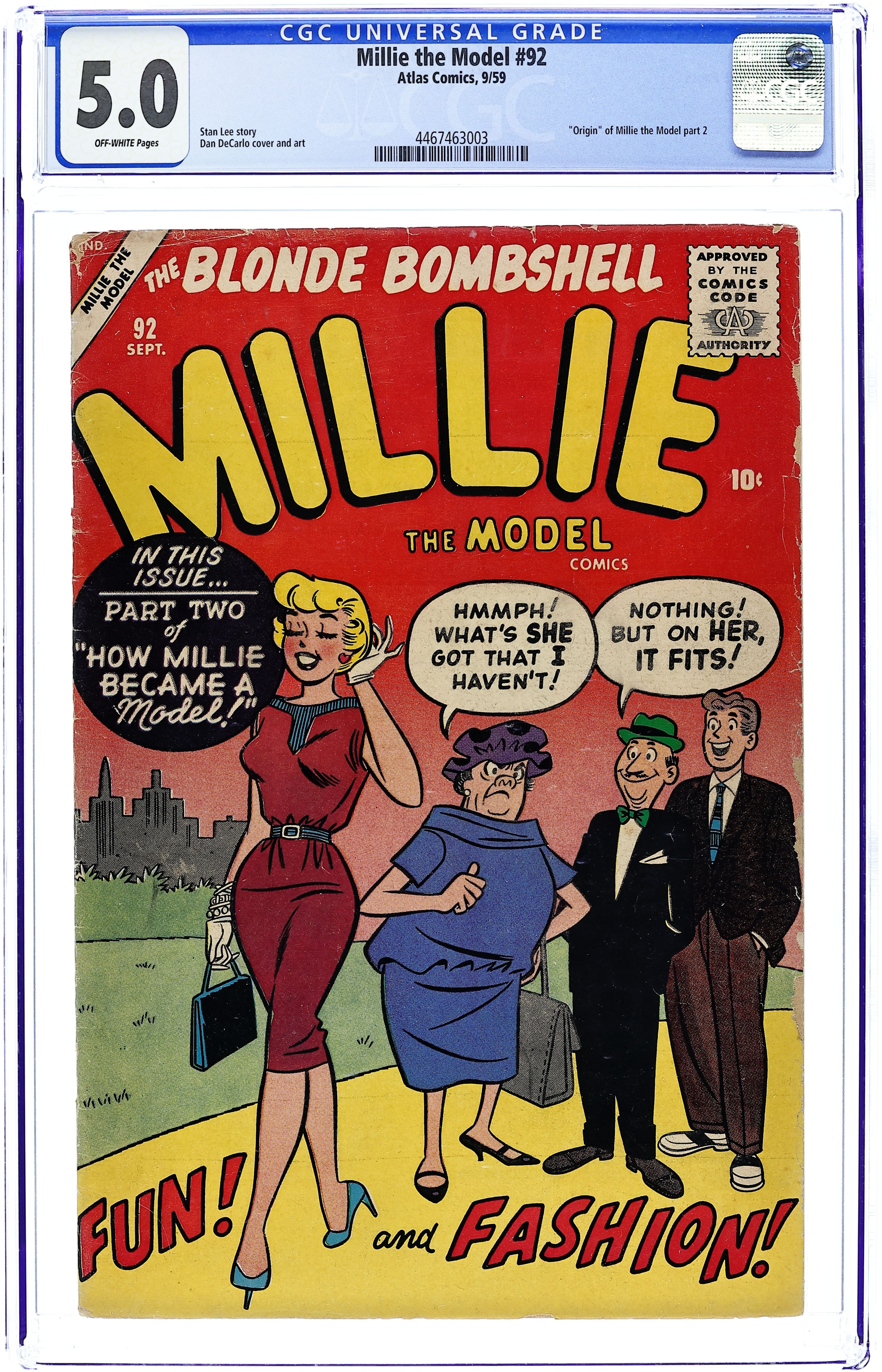 Stories by Stan Lee. Art and Cover by Dan DeCarlo. Millie the Model in: two untitled stories; "Millie Models..." 4-pager; three untitled 1-pagers; "Millie's Fashion Page" half-pager; and two untitled half-pagers. Plus: "Chili's Fashion Page" half-pager; 2-page text story "Mr. Carmichael" (writer unknown); and untitled My Girl Pearl story. 32 pages, full color. Cover price $0.10.
