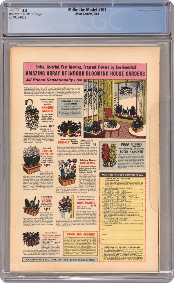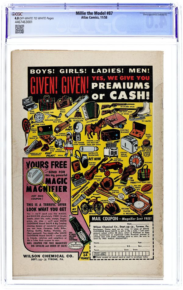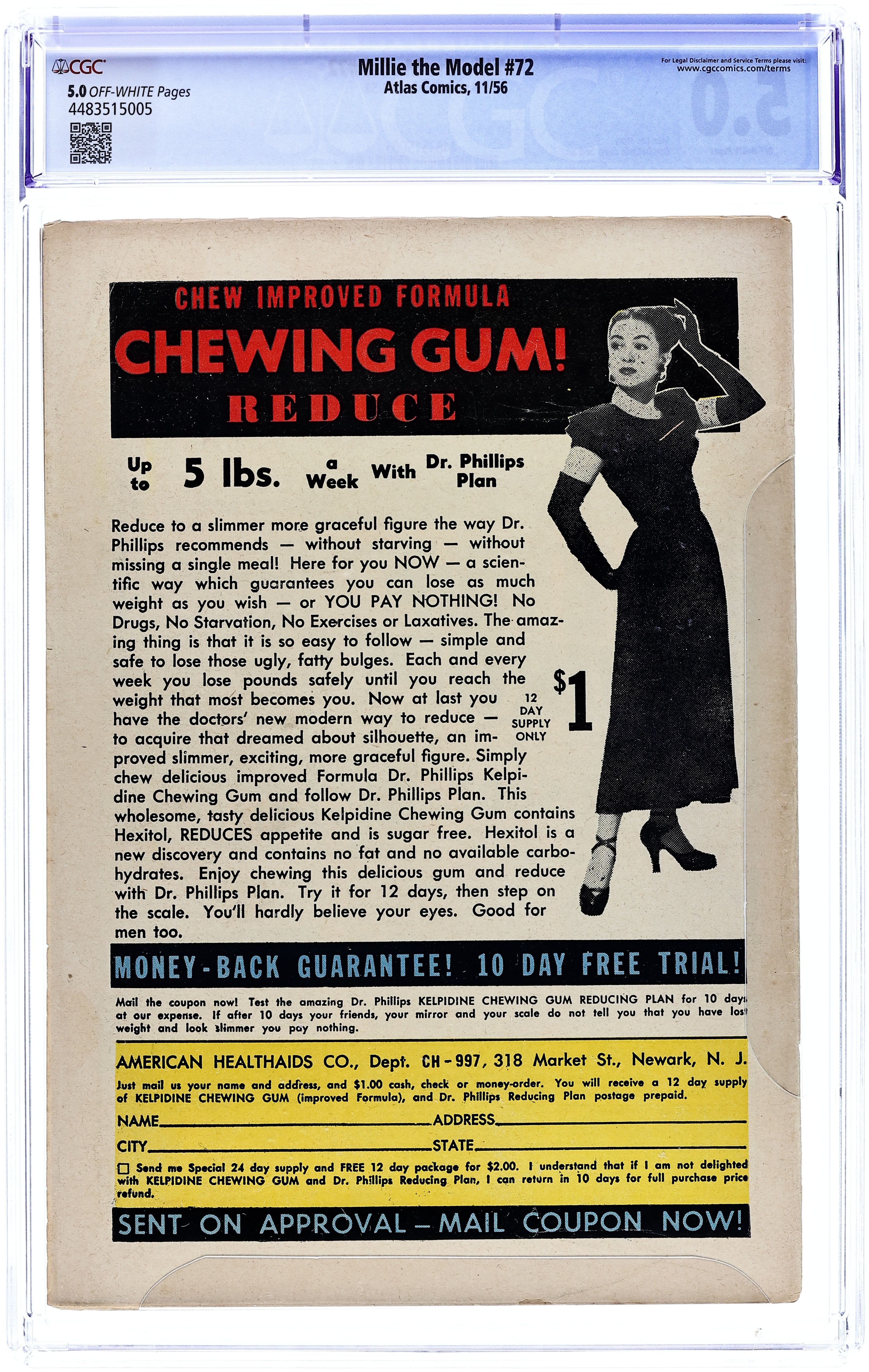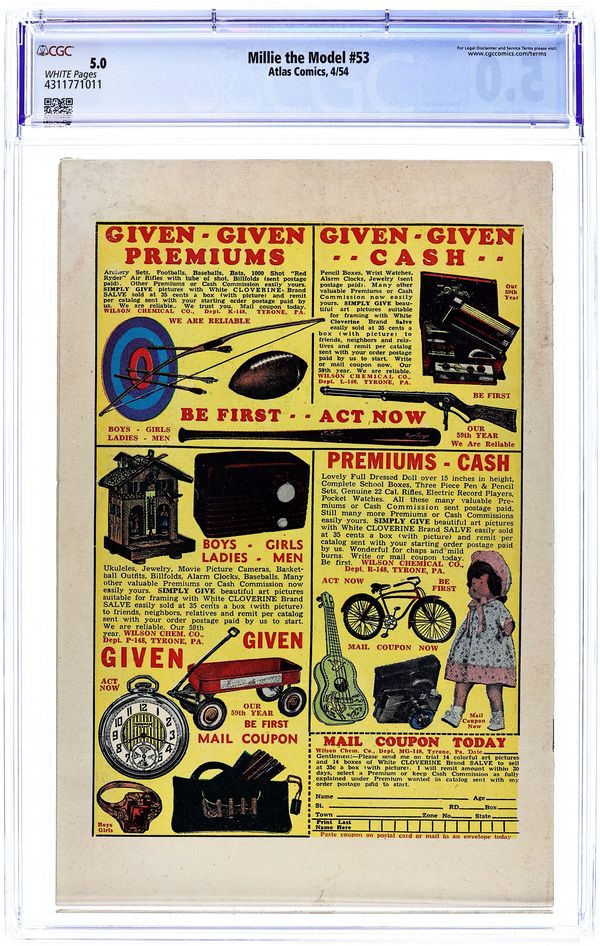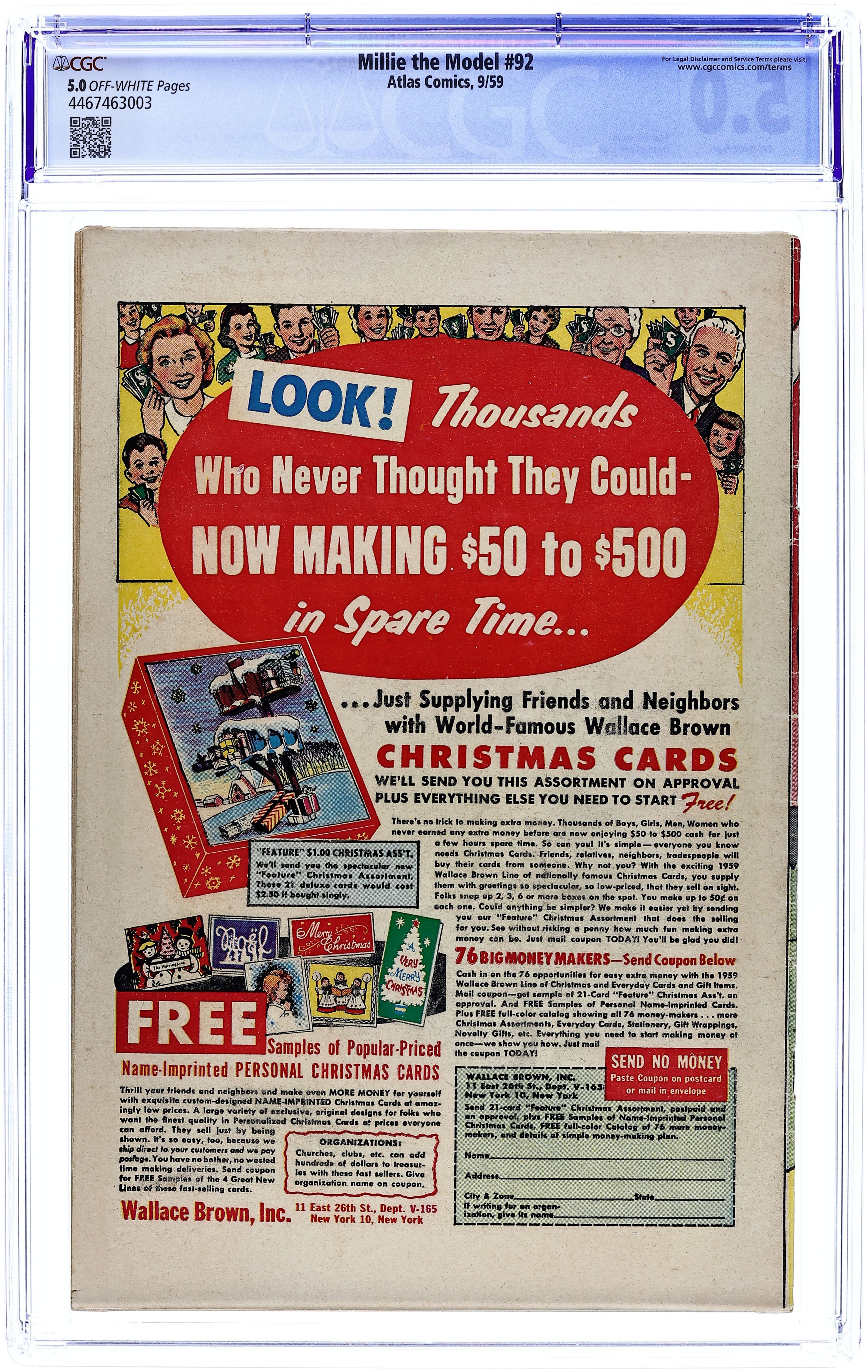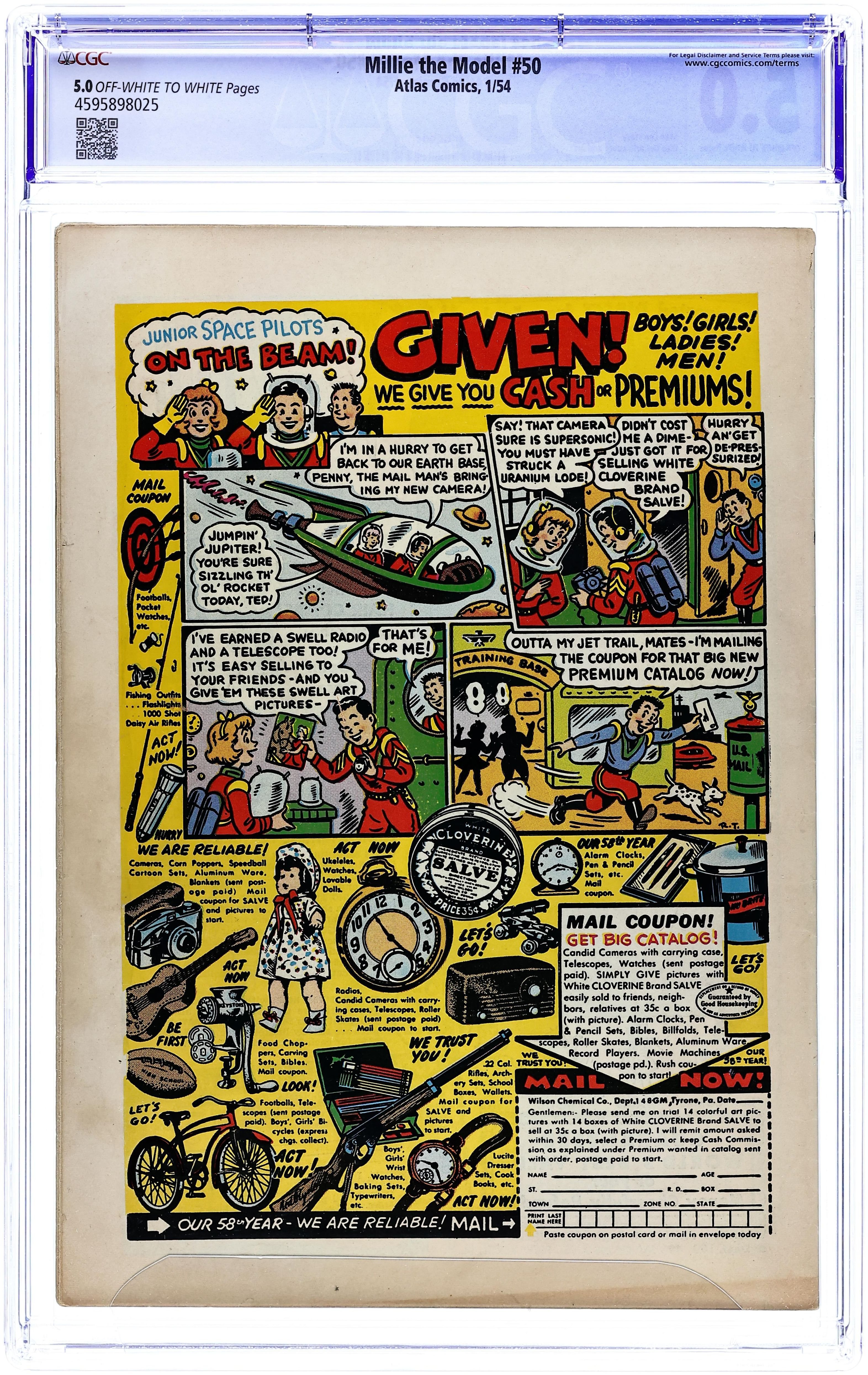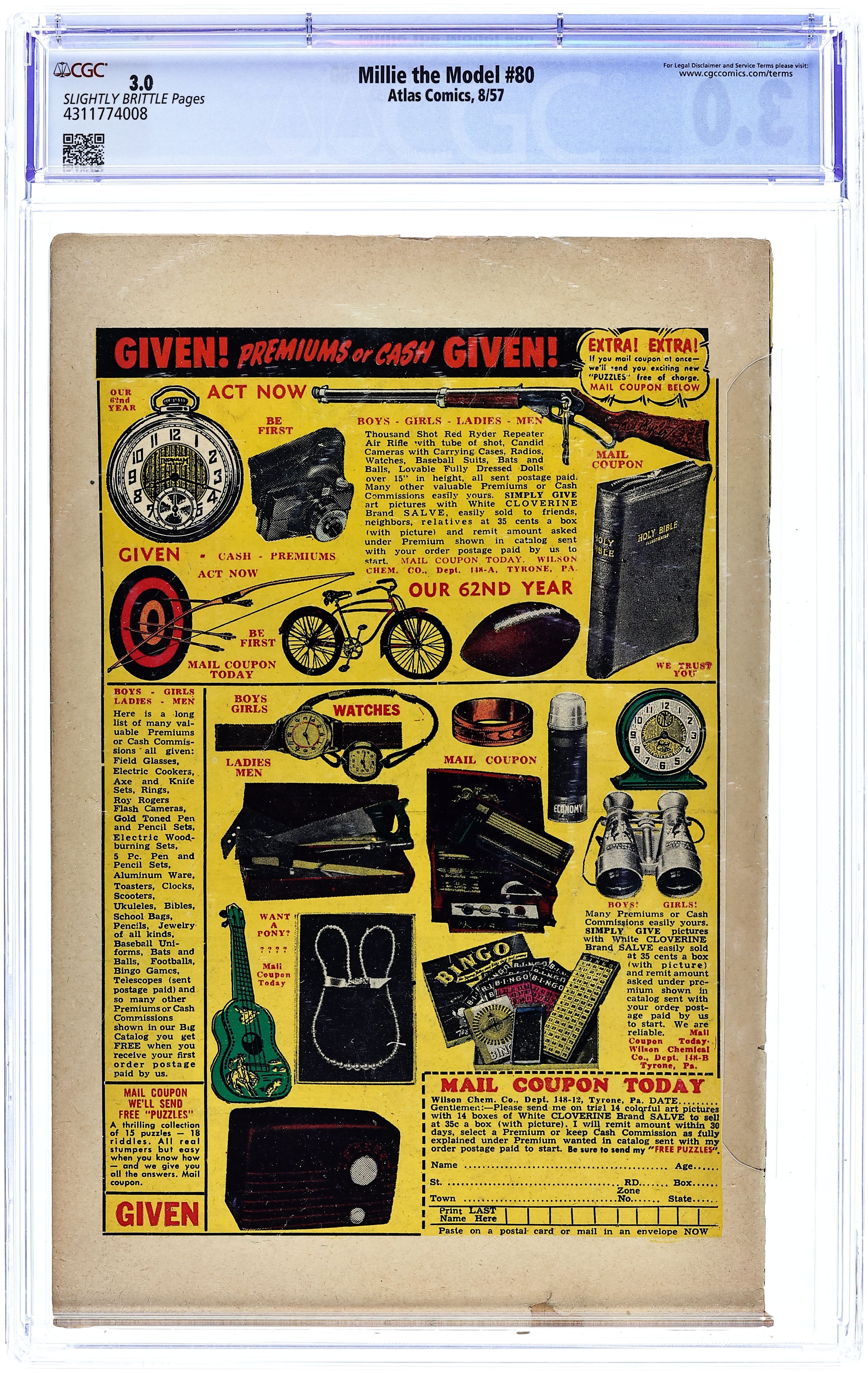 Stories by Stan Lee. Art and Cover by Dan DeCarlo. Millie the Model in: two untitled stories; "Millie Models..." 4-pager; three untitled 1-pagers; "Millie's Fashion Page" half-pager; and two untitled half-pagers. Plus: "Chili's Fashion Page" half-pager; 2-page text story "Mr. Carmichael" (writer unknown); and untitled My Girl Pearl story. 32 pages, full color. Cover price $0.10.